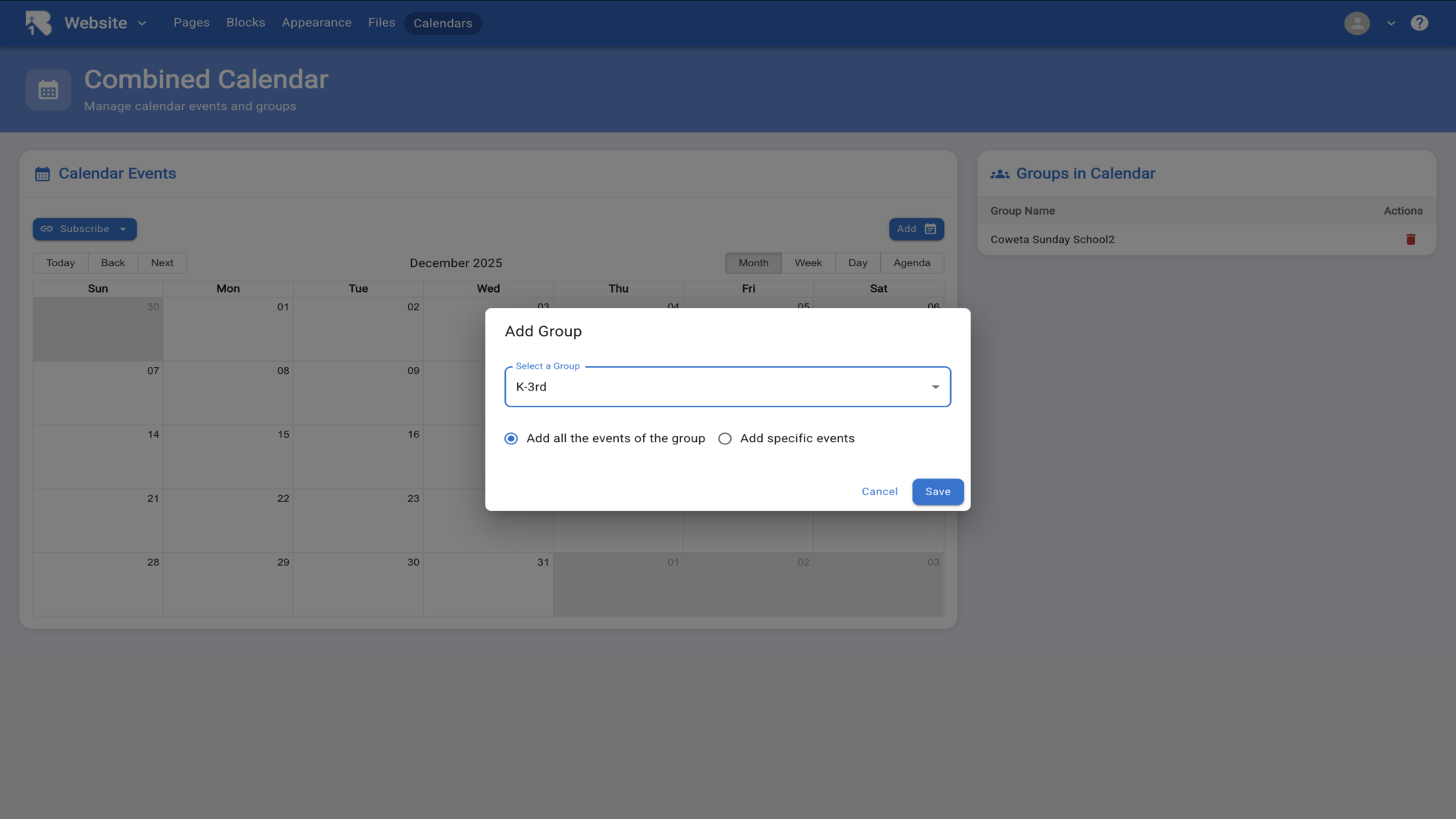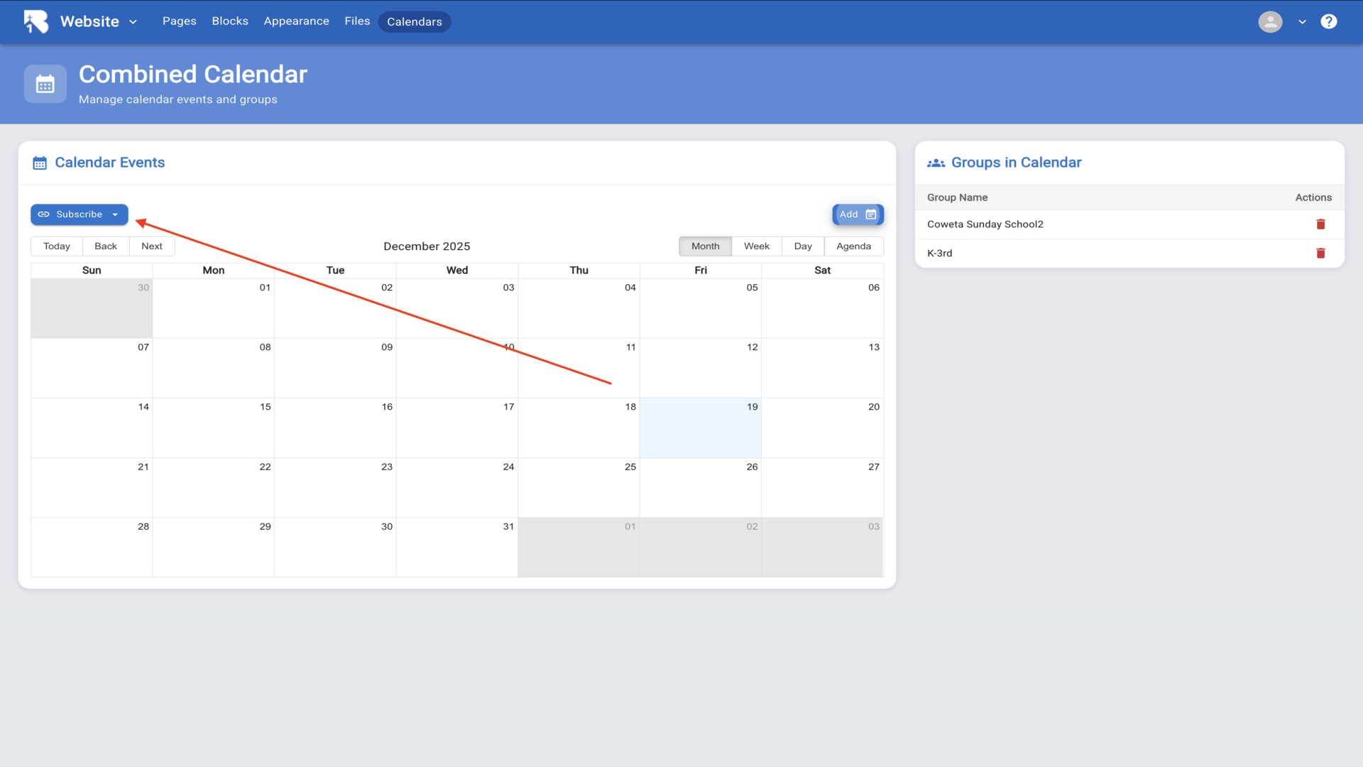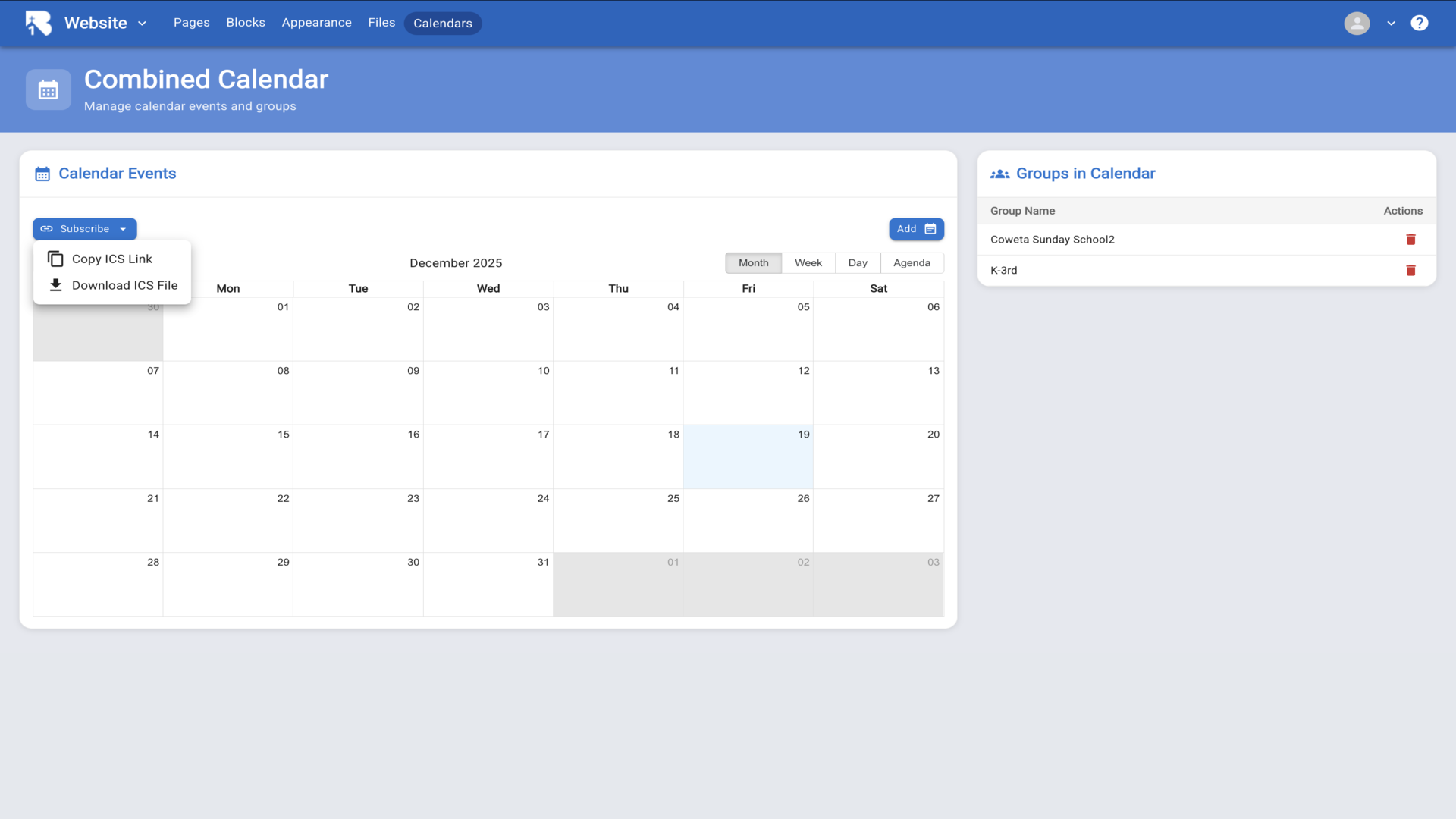 Click Subscribe to copy the ICS link or download the file to share your calendar. Your calendar can now be embedded on your website and mobile app