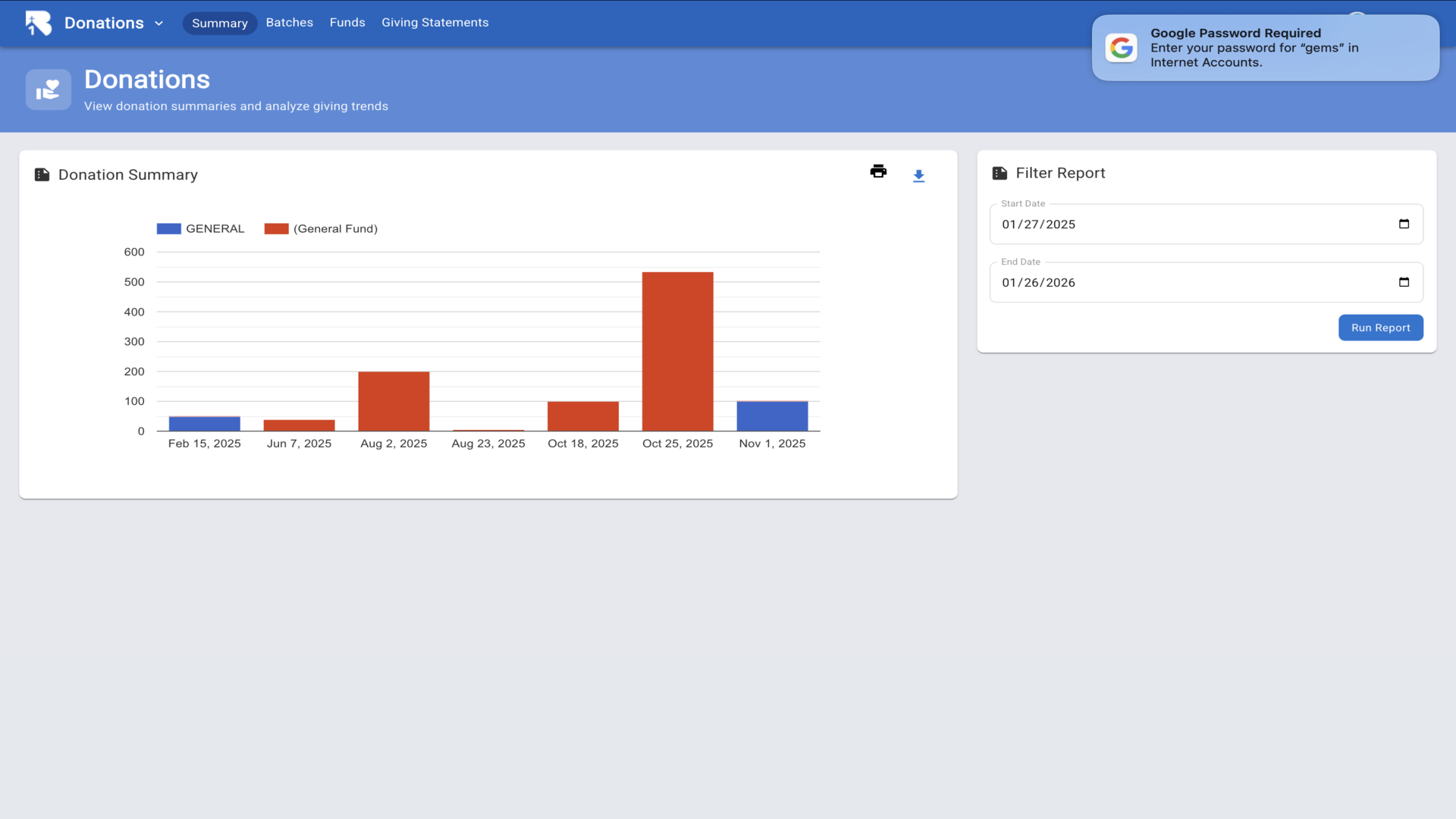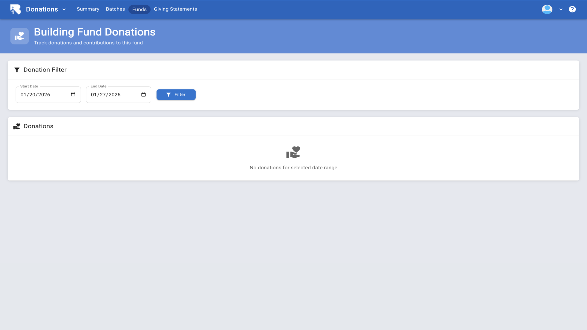 14.The fund detail page shows all donations with date range filters and summary statistics.▼