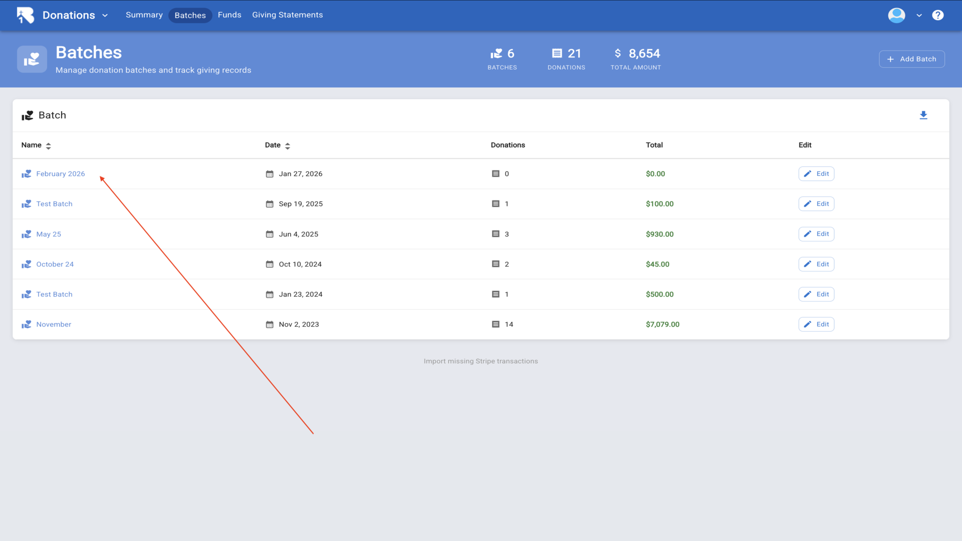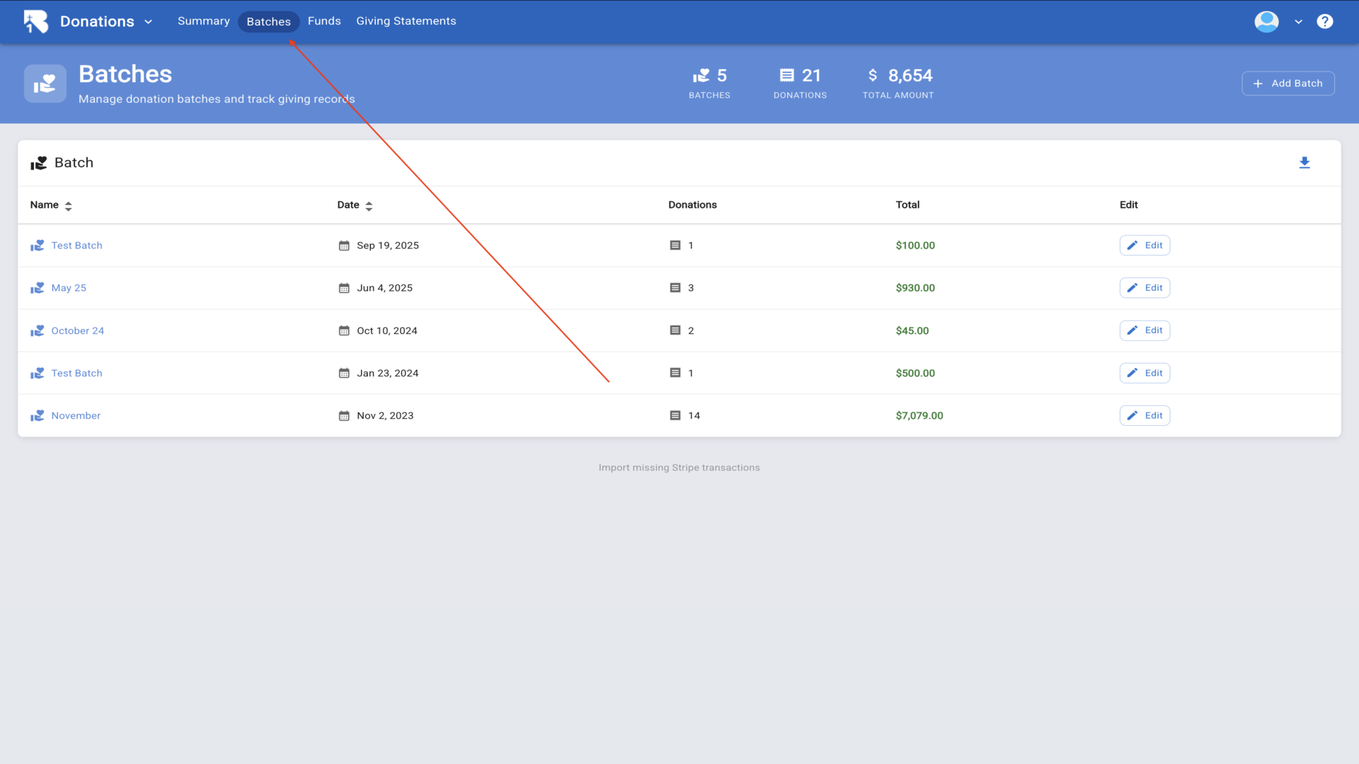15.Now let's enter donations. Navigate back to the Batches page to manage donation batches.▼