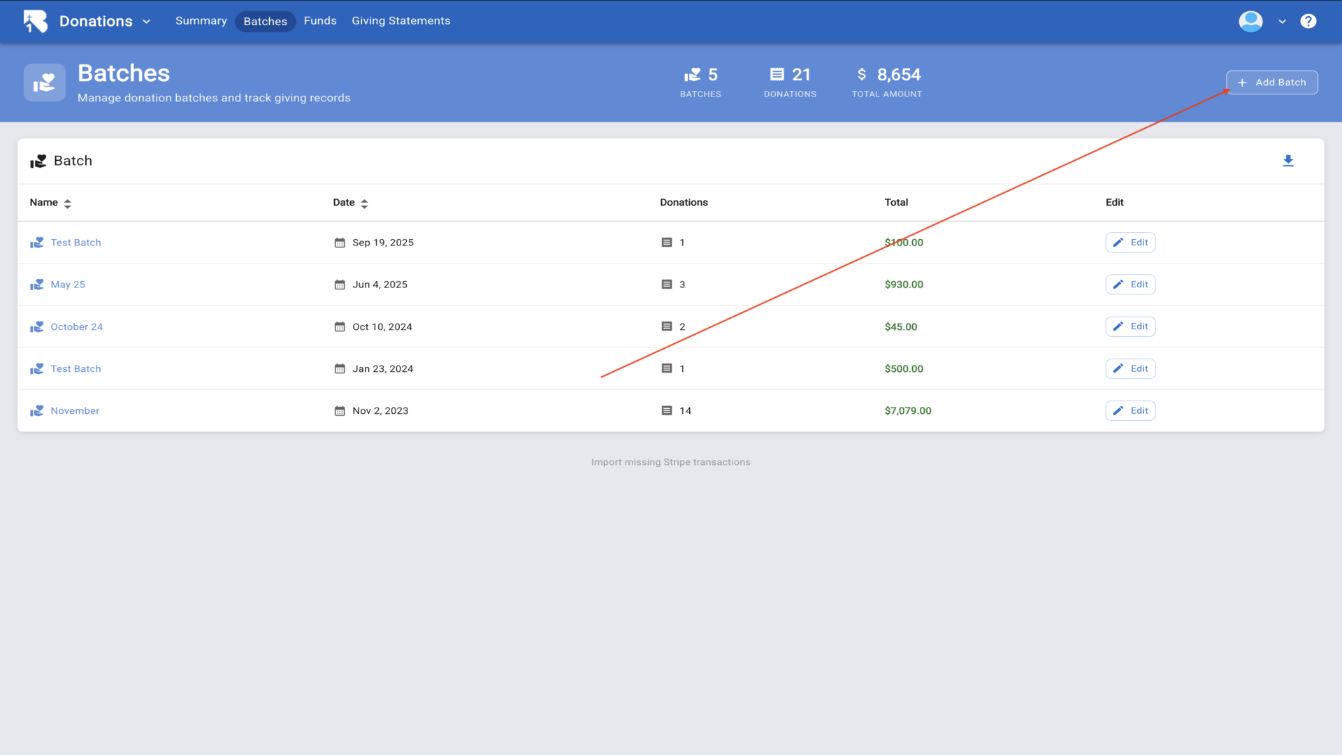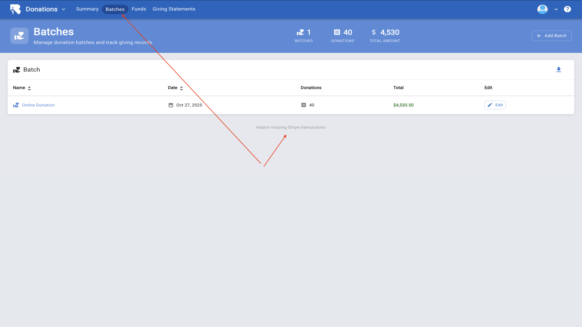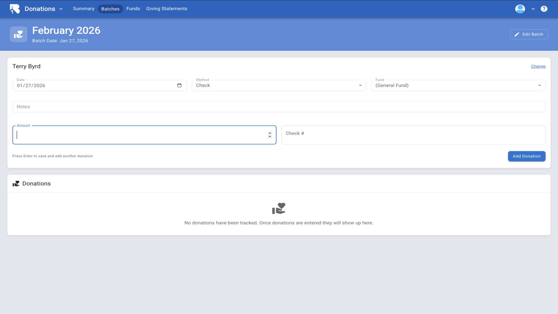 16.Click Add Batch to create a new batch for organizing donations.▼