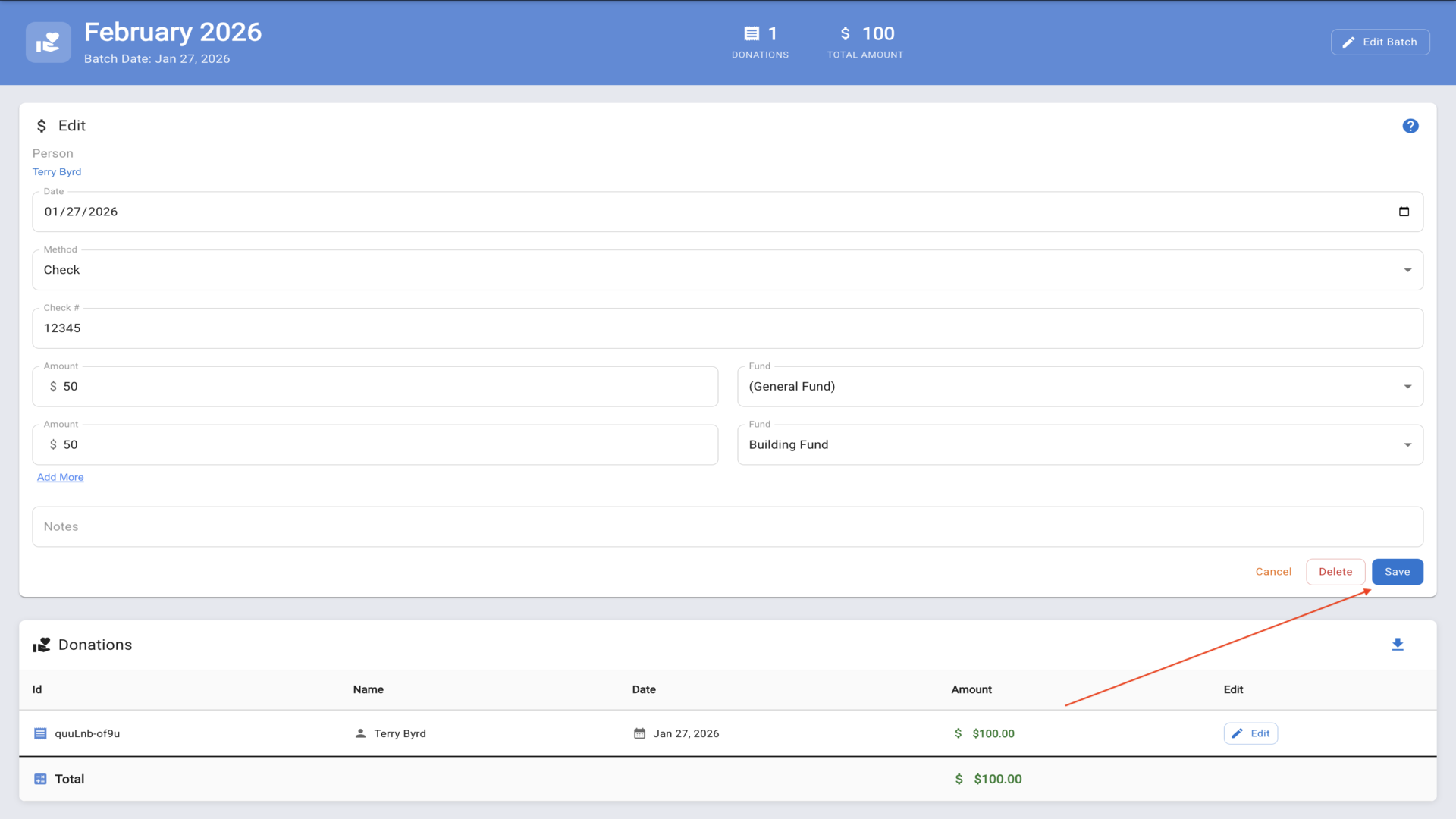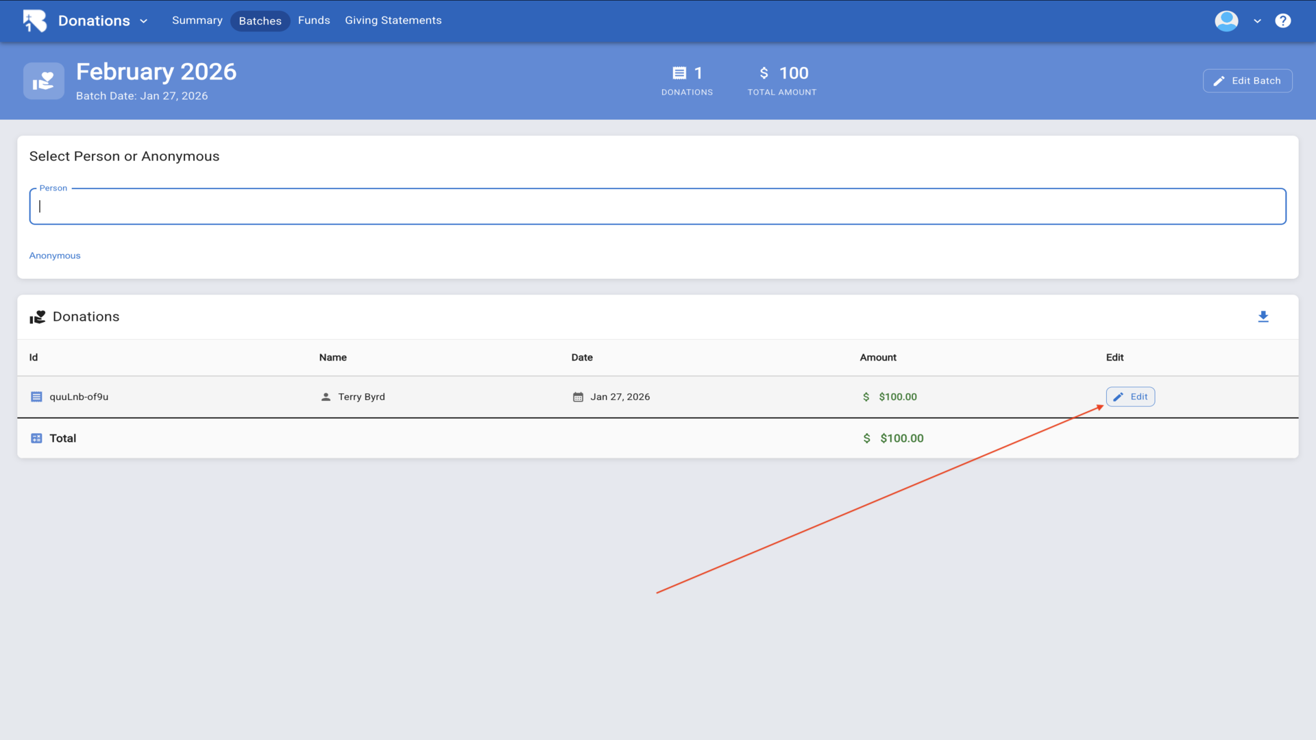 19.Click on the batch name to open it and begin entering donations.▼