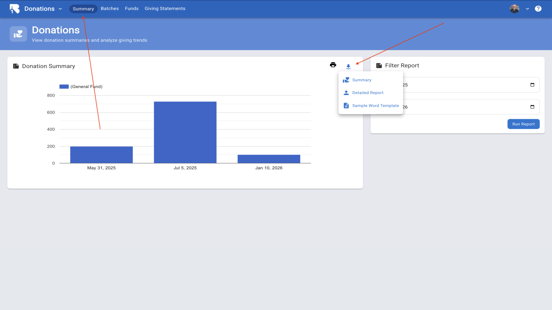 28.The Donations Summary page shows visual reports with options to view different report formats.▼
