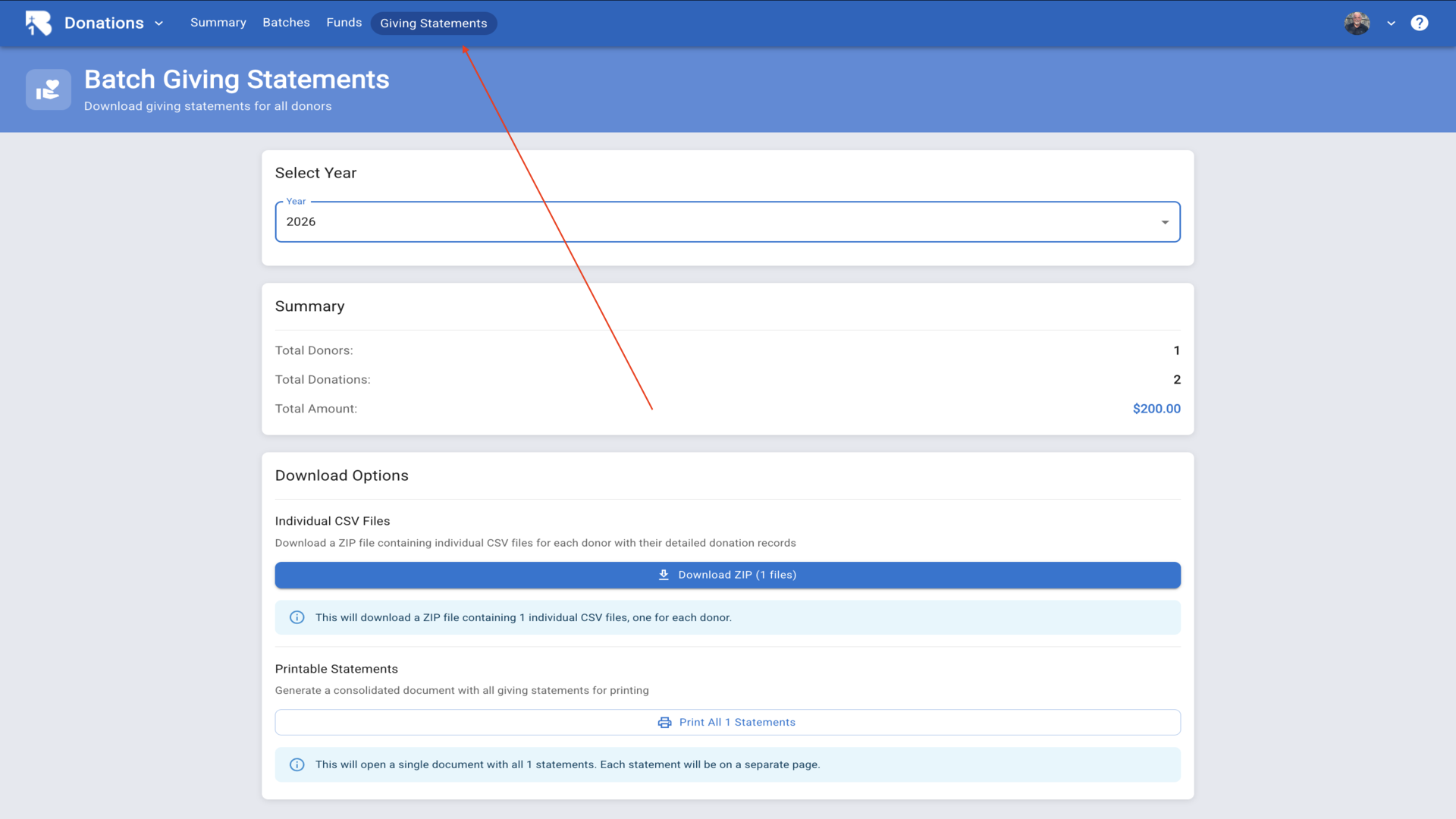 29.Navigate to Giving Statements to download tax receipts for all donors for a selected year.▼