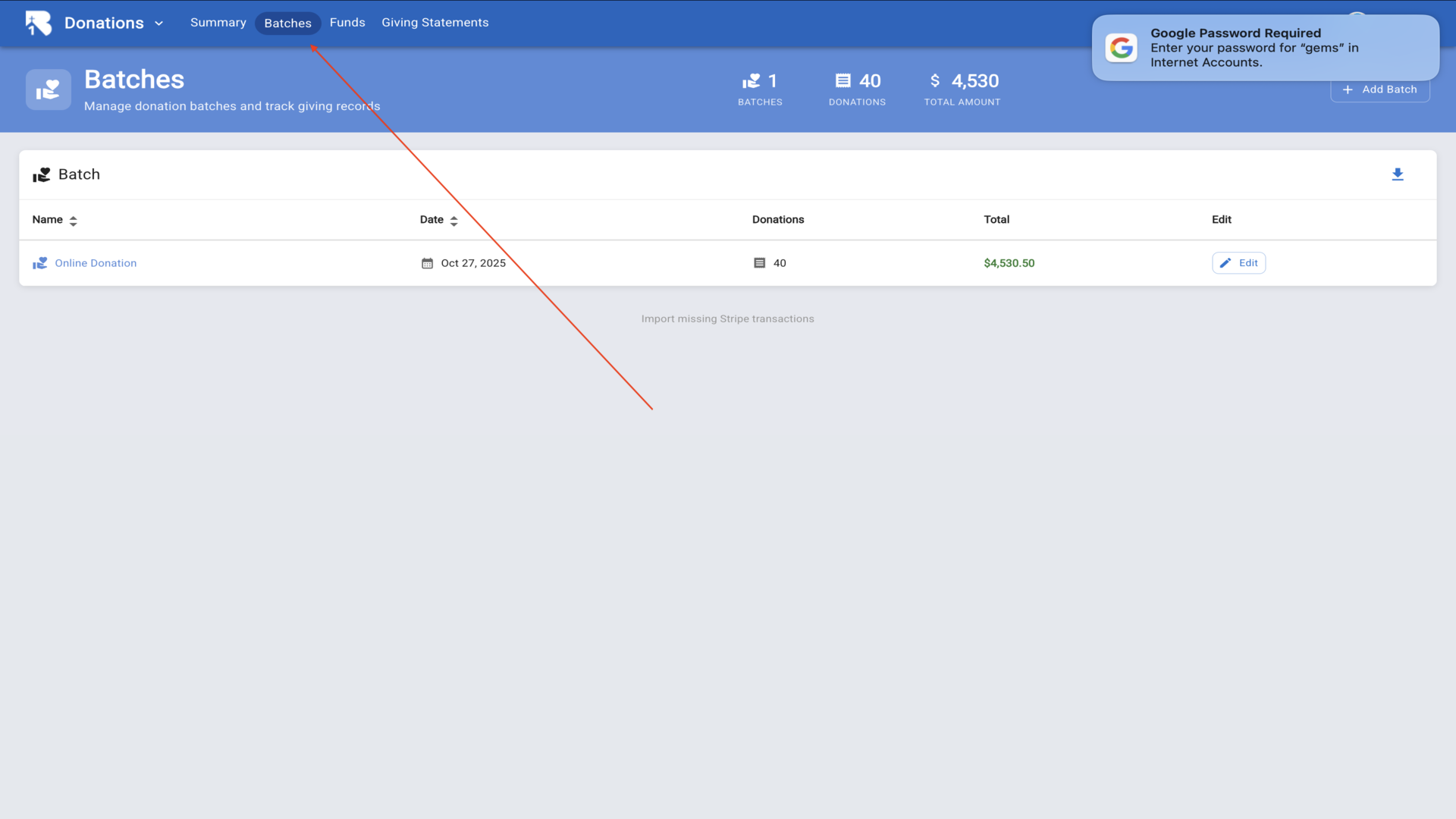 3.Click on Batches to manage your donation batches.▼