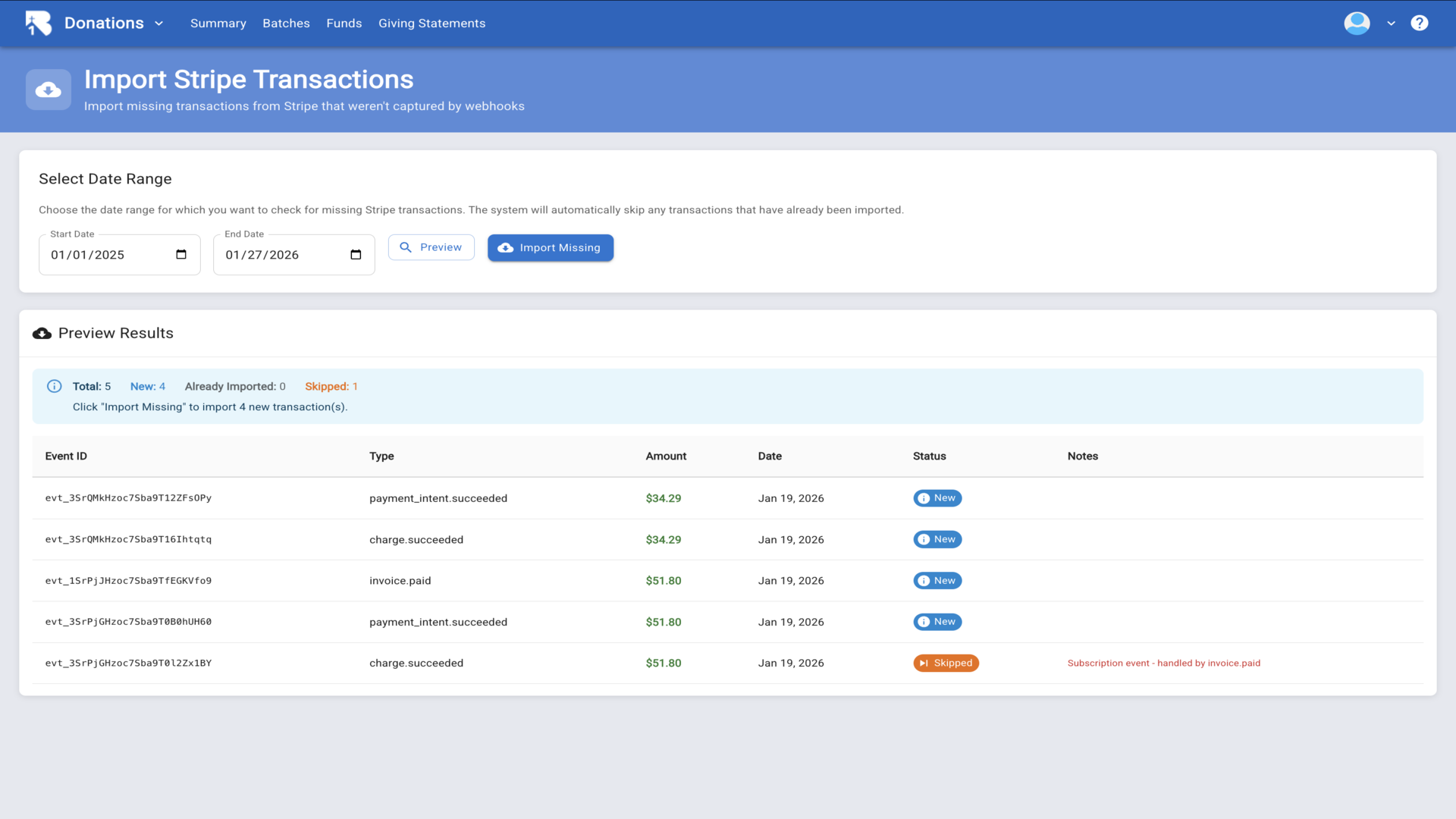 35.Click Preview to see which transactions would be imported, then Import Missing to complete the import. You now know how to create funds, manage batches, enter donations, and generate giving statements in B1 Admin.▼