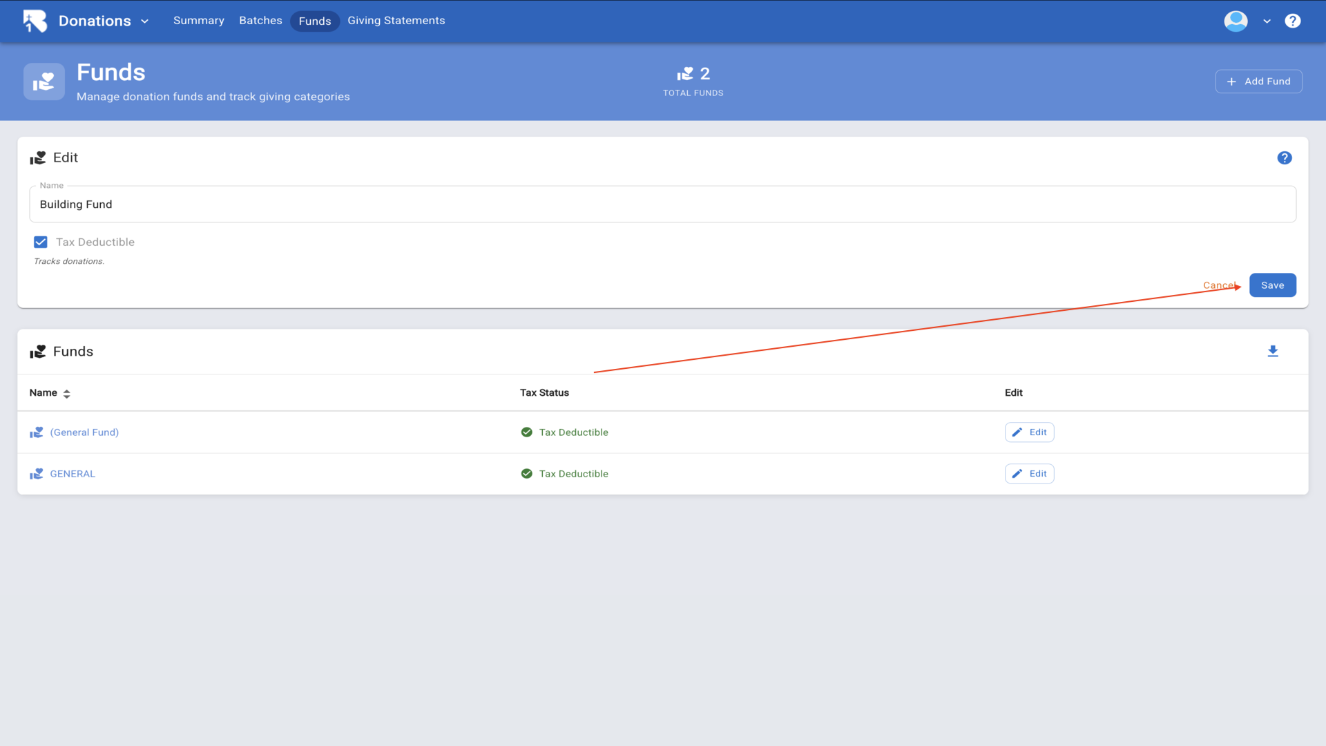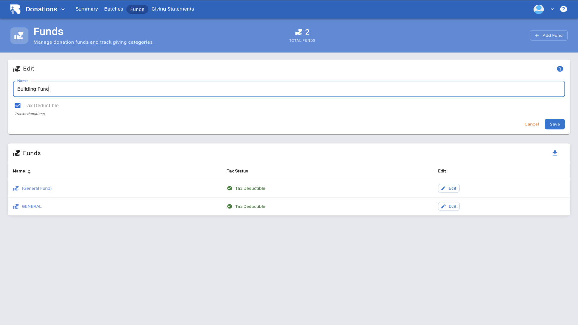 6.The fund edit form opens with fields for the name and tax deductible status.▼