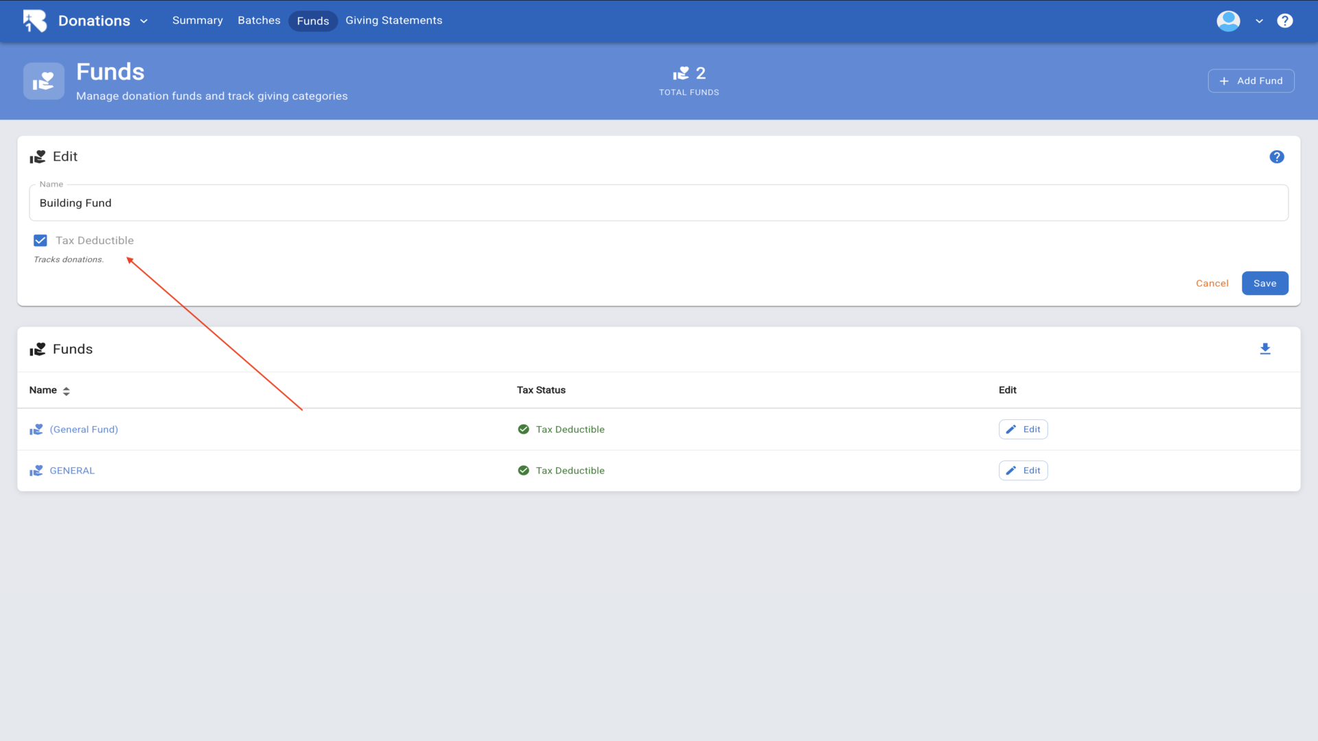 8.The Tax Deductible checkbox determines if donations to this fund are included in annual giving statements.▼