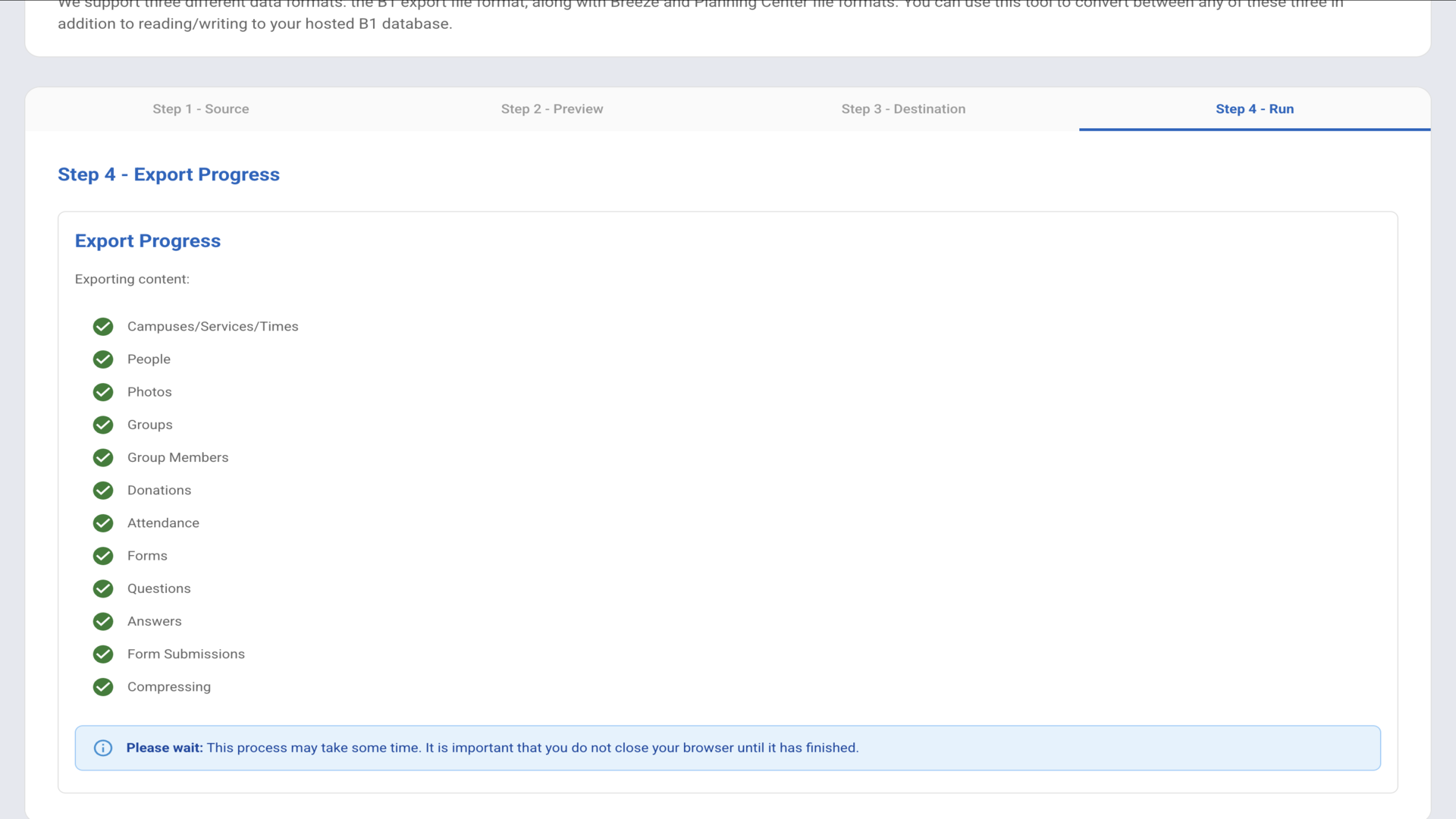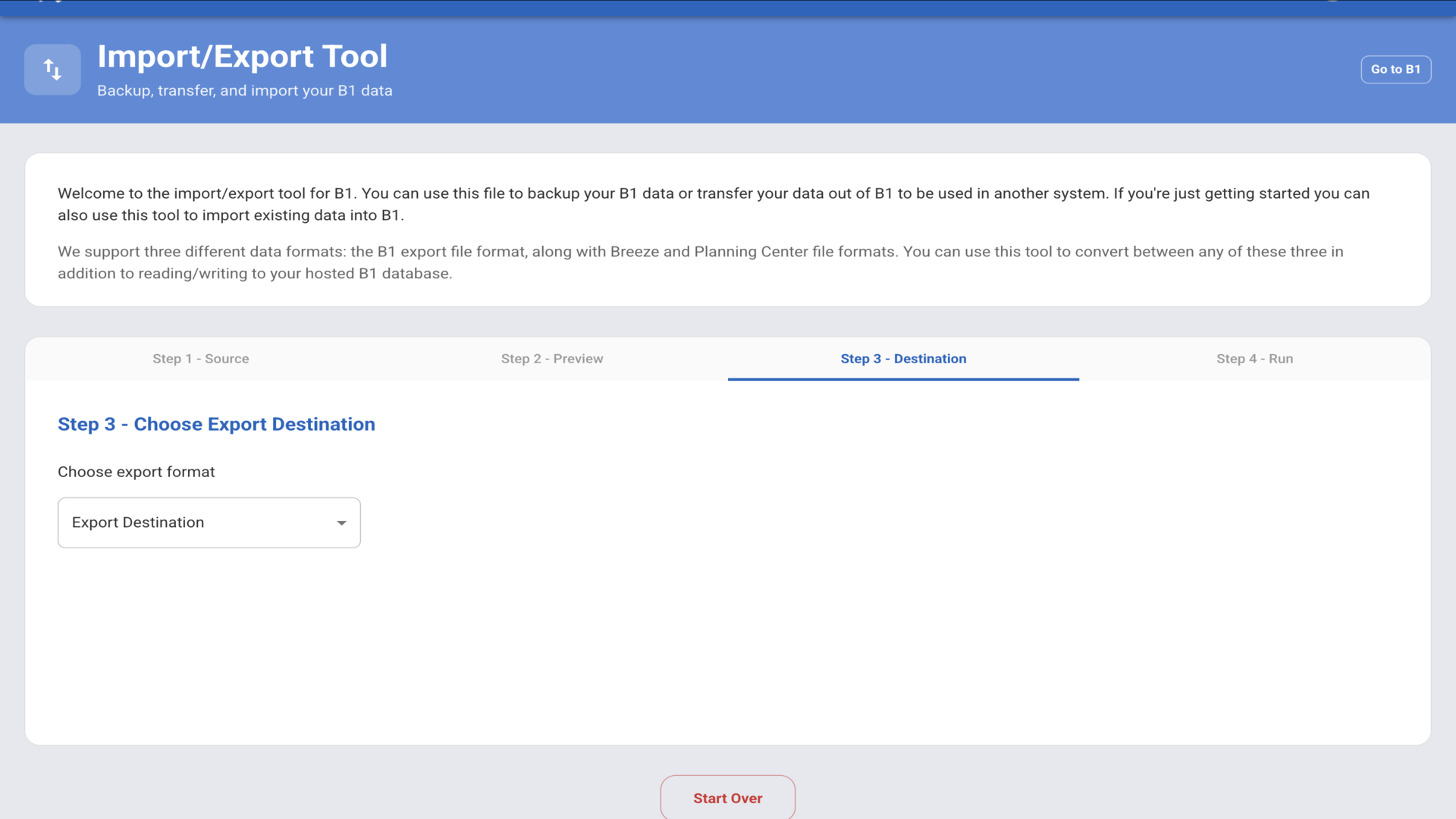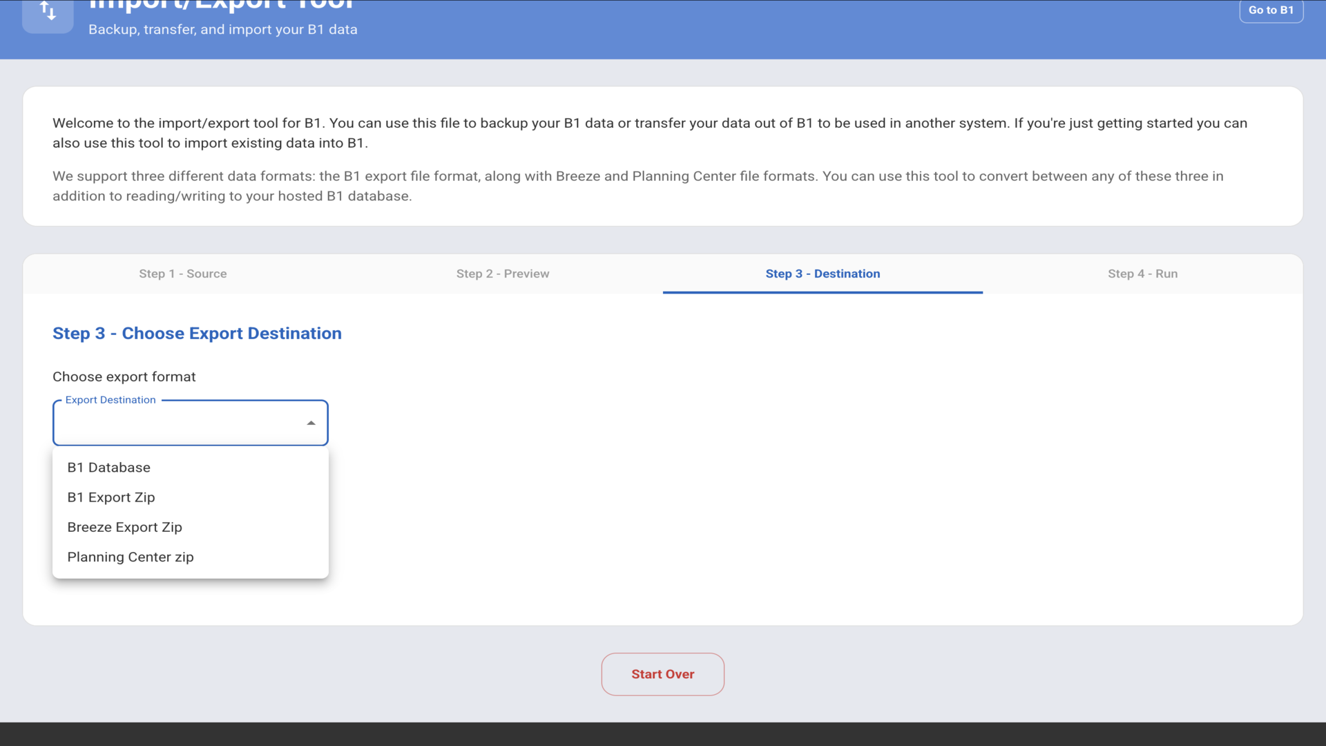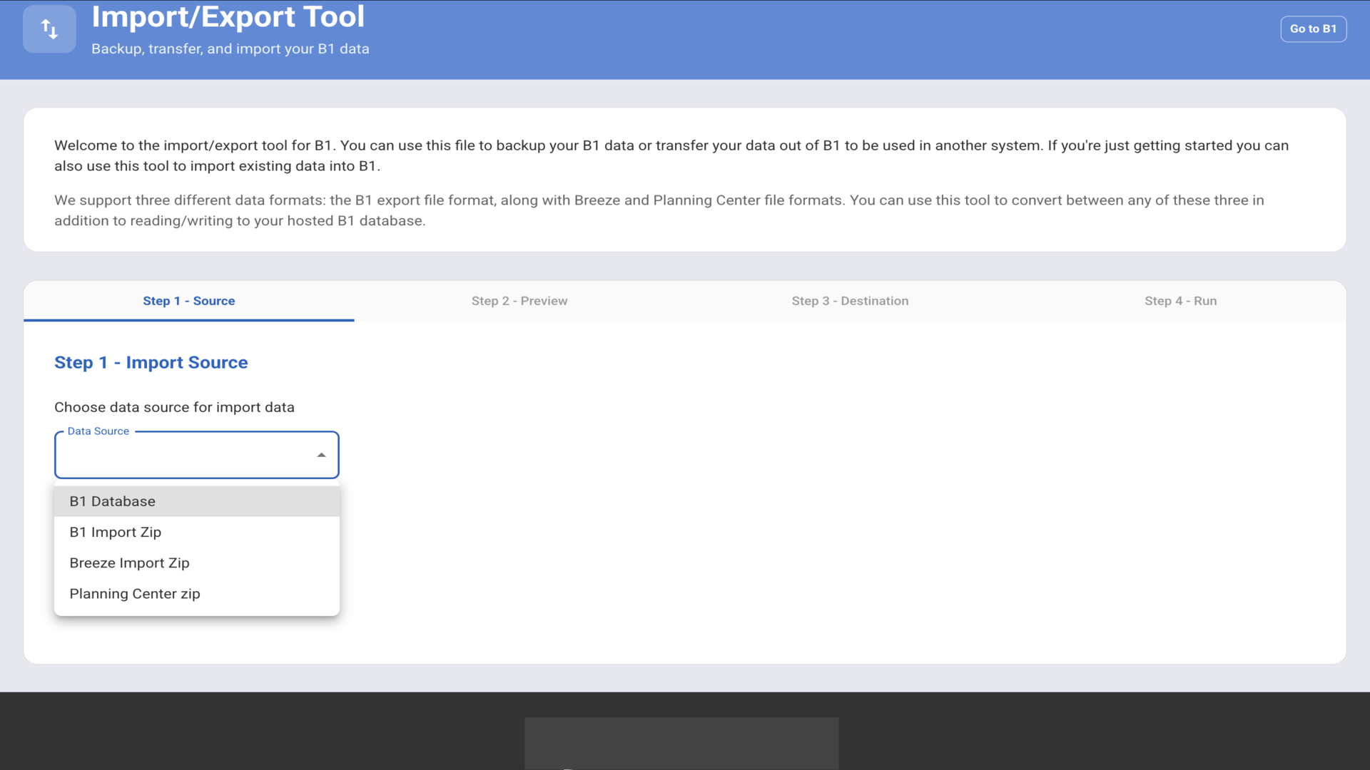 Select "B1 Database" from the dropdown menu to export your B1 church data