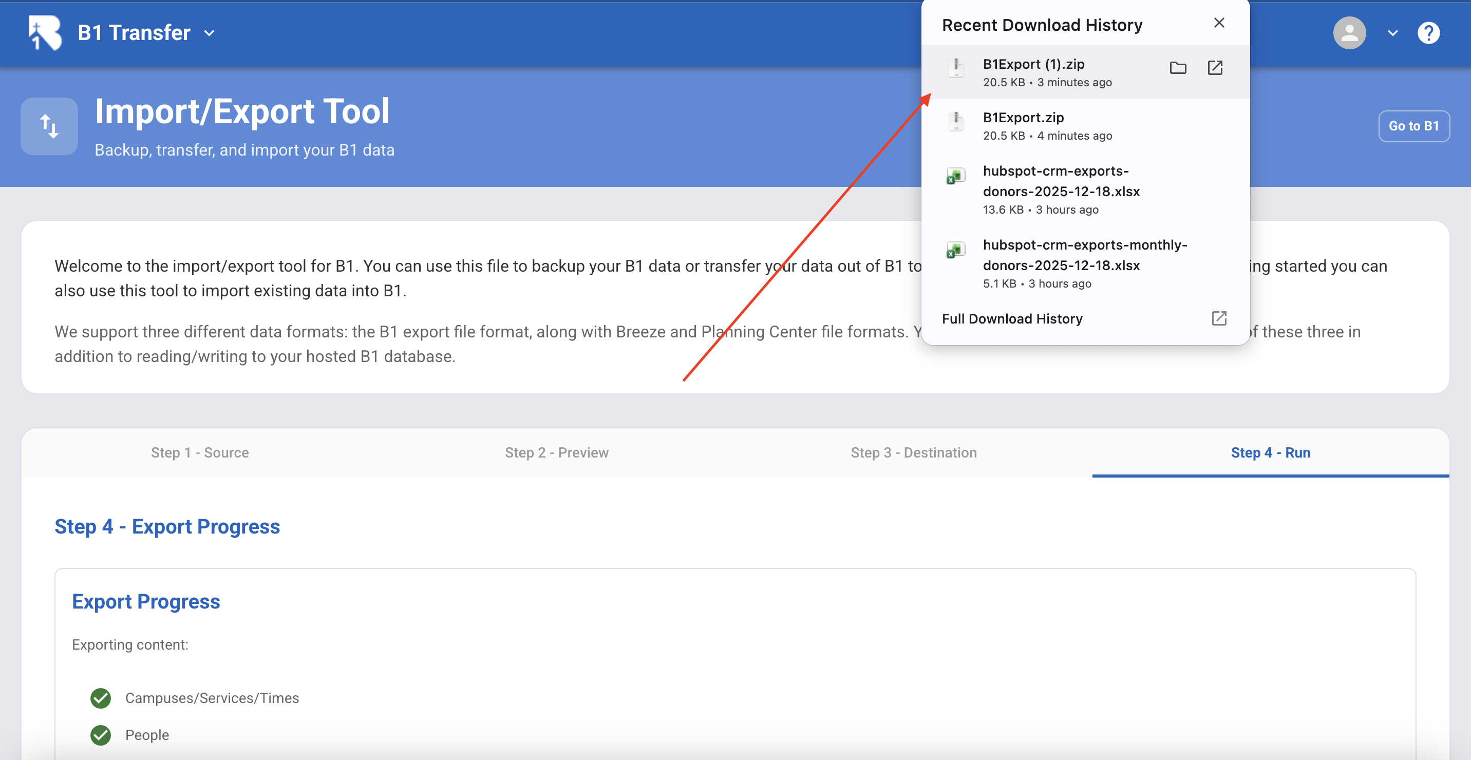 View the downloaded B1Export file in the Recent Download History