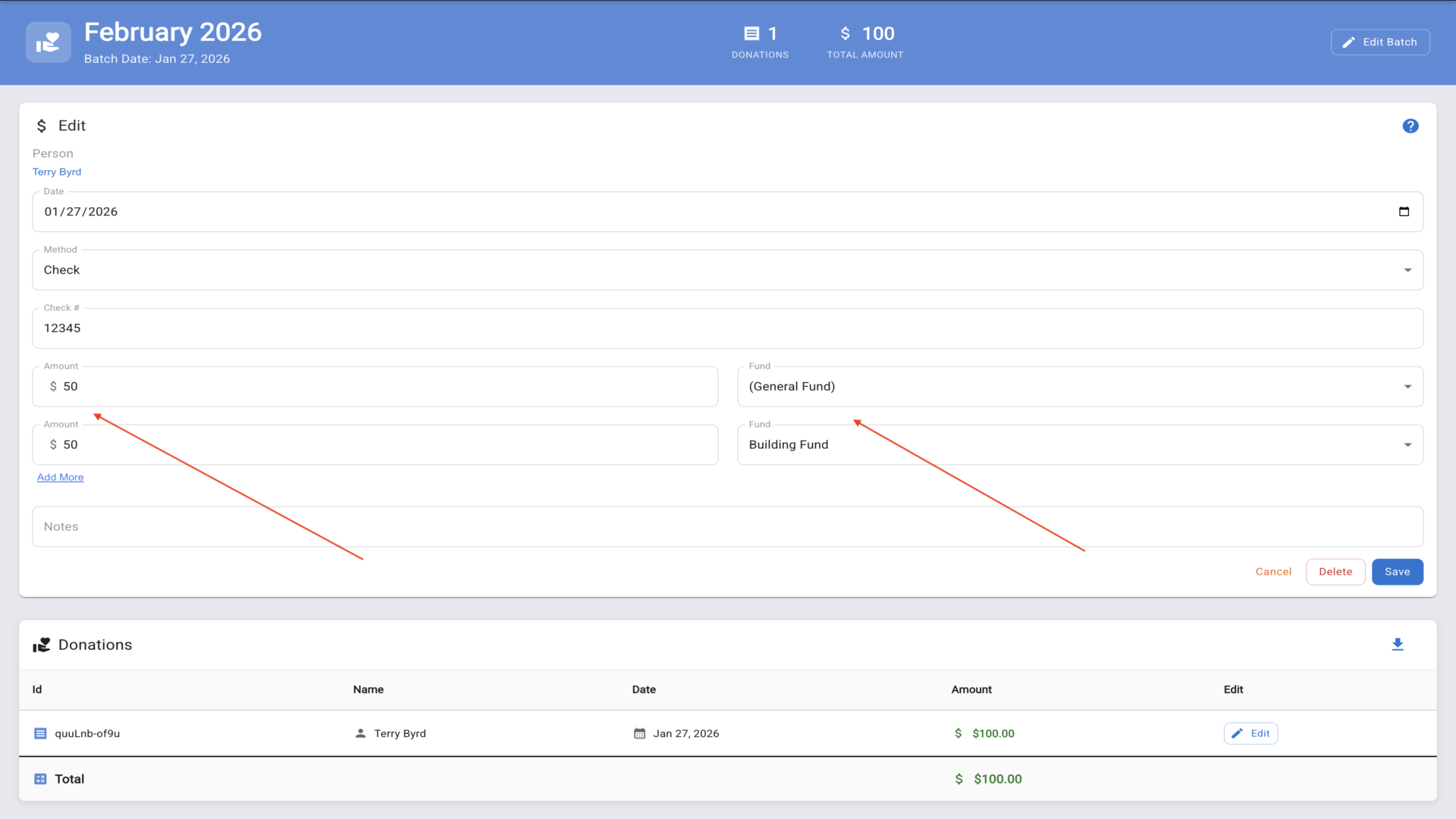 13.Click Save to update the donation with your multi-fund allocation. You now know how to manually enter donations and split them across multiple funds.▼