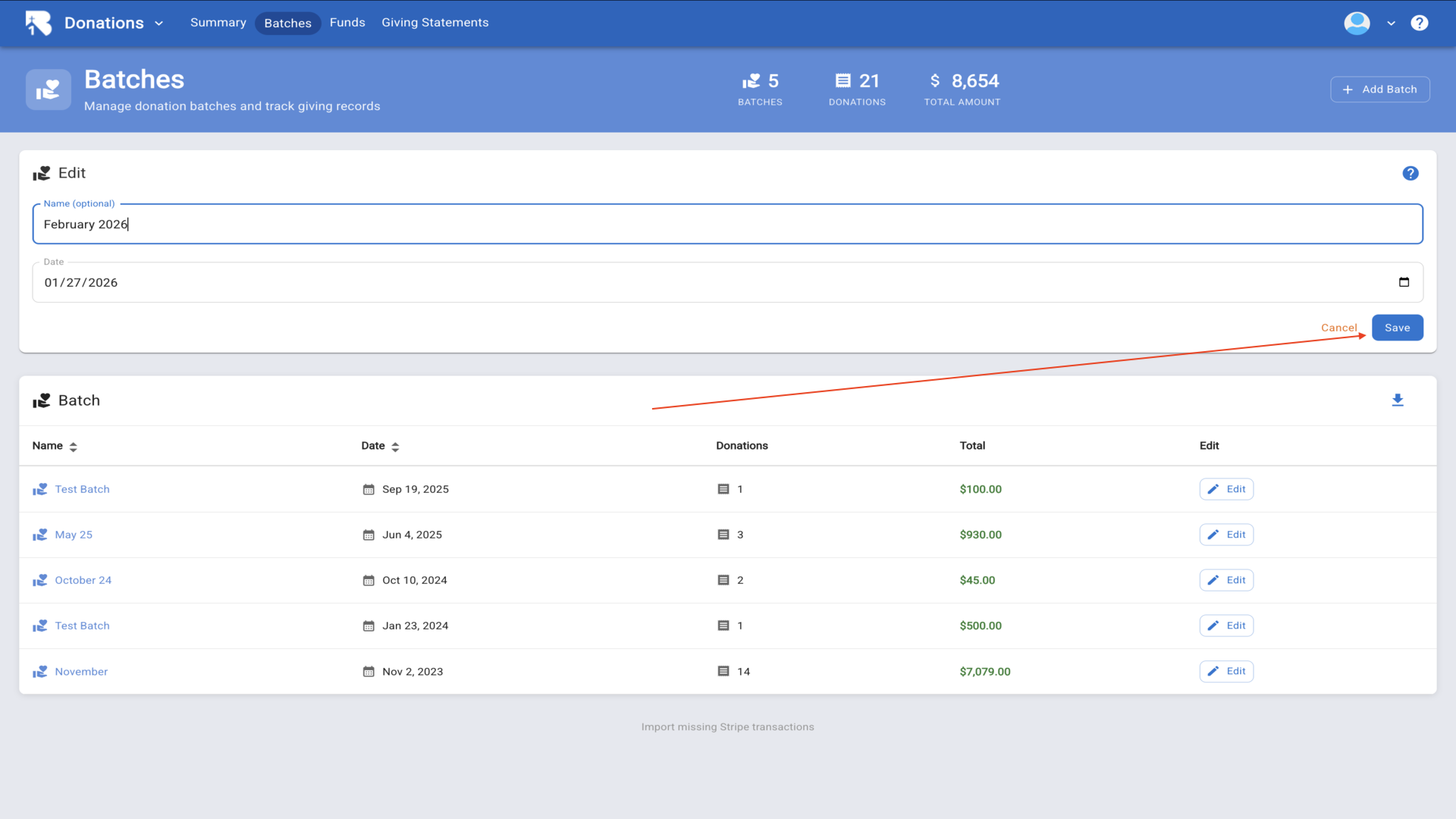 2.Navigate to the Batches page and click Add Batch to create a new batch for organizing donations.▼