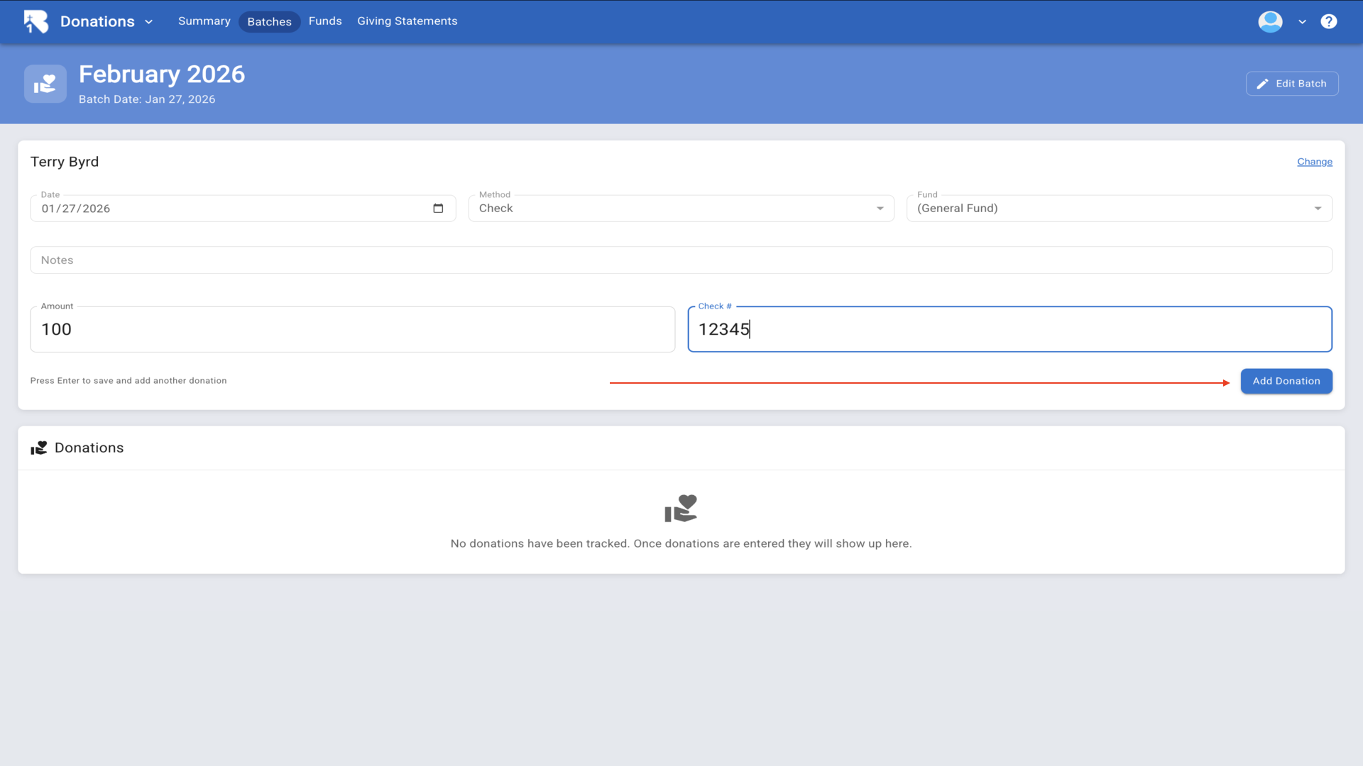 5.Click on the batch name to open it and begin entering donations.▼