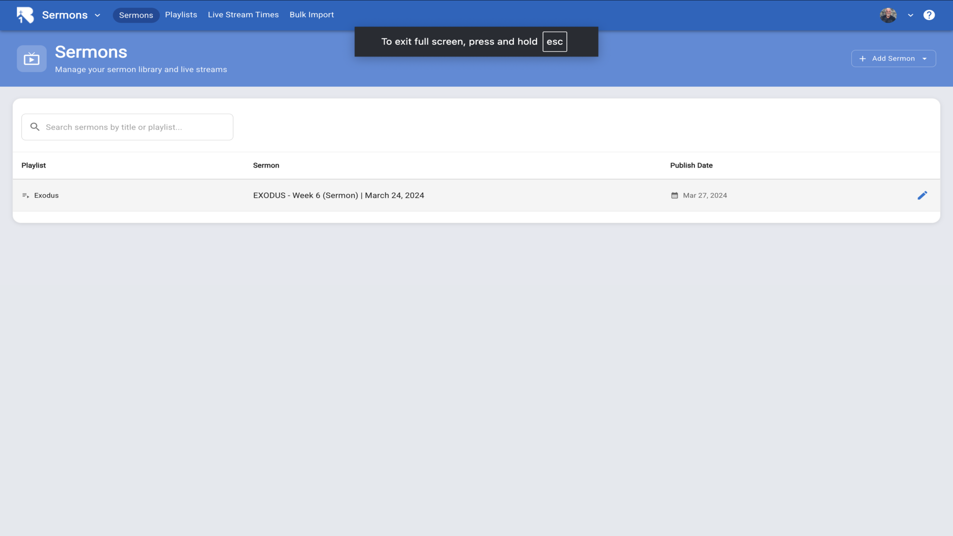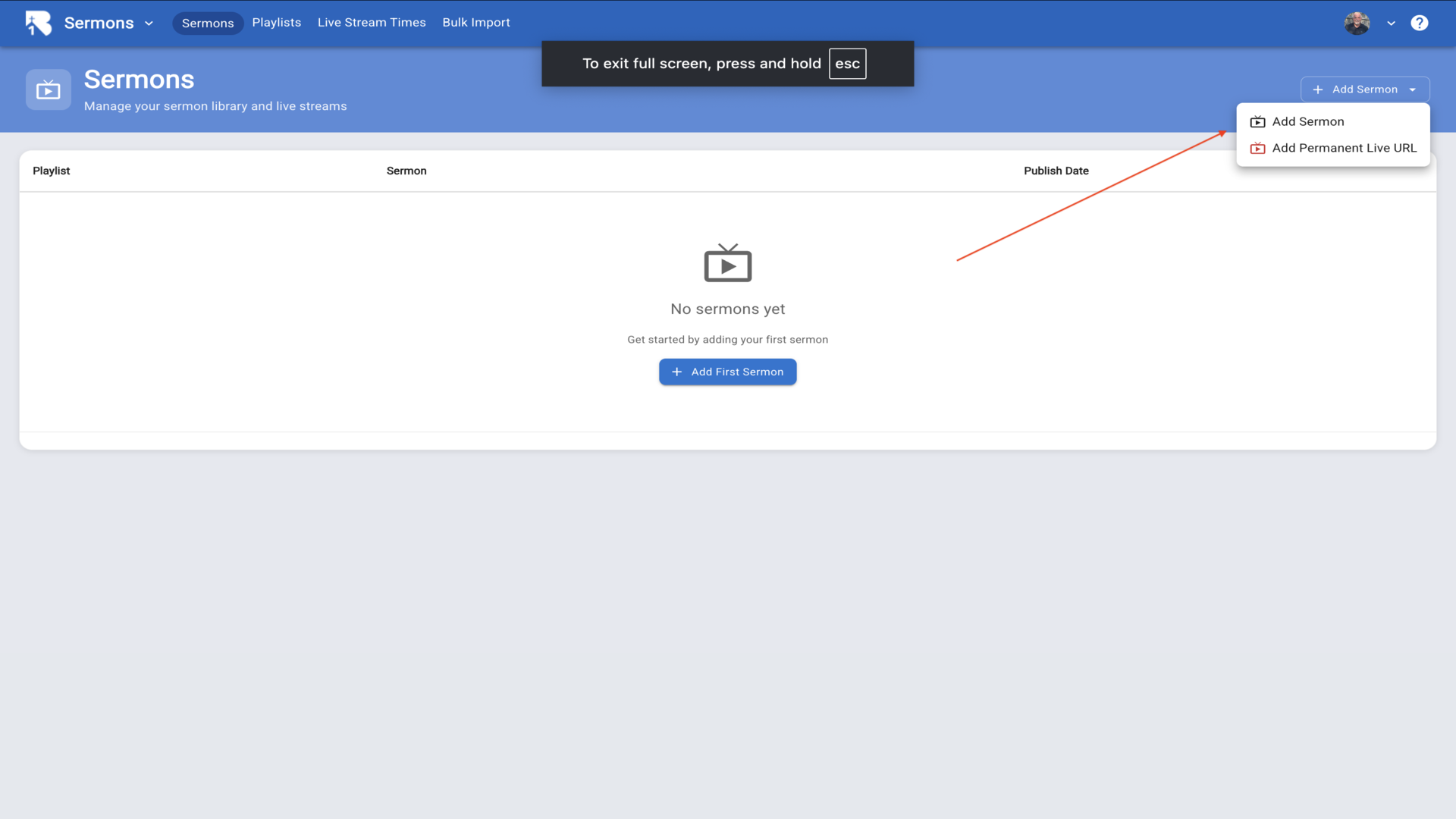 On the Sermons page, click the Add Sermon button in the top right corner and select Add Sermon from the dropdown.