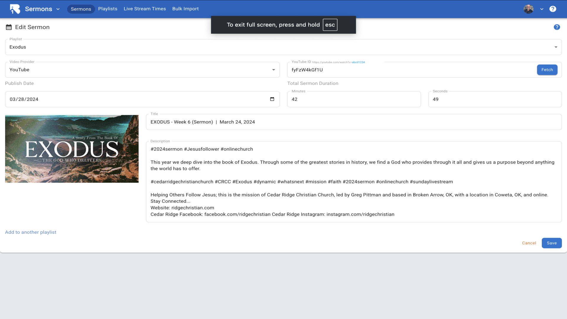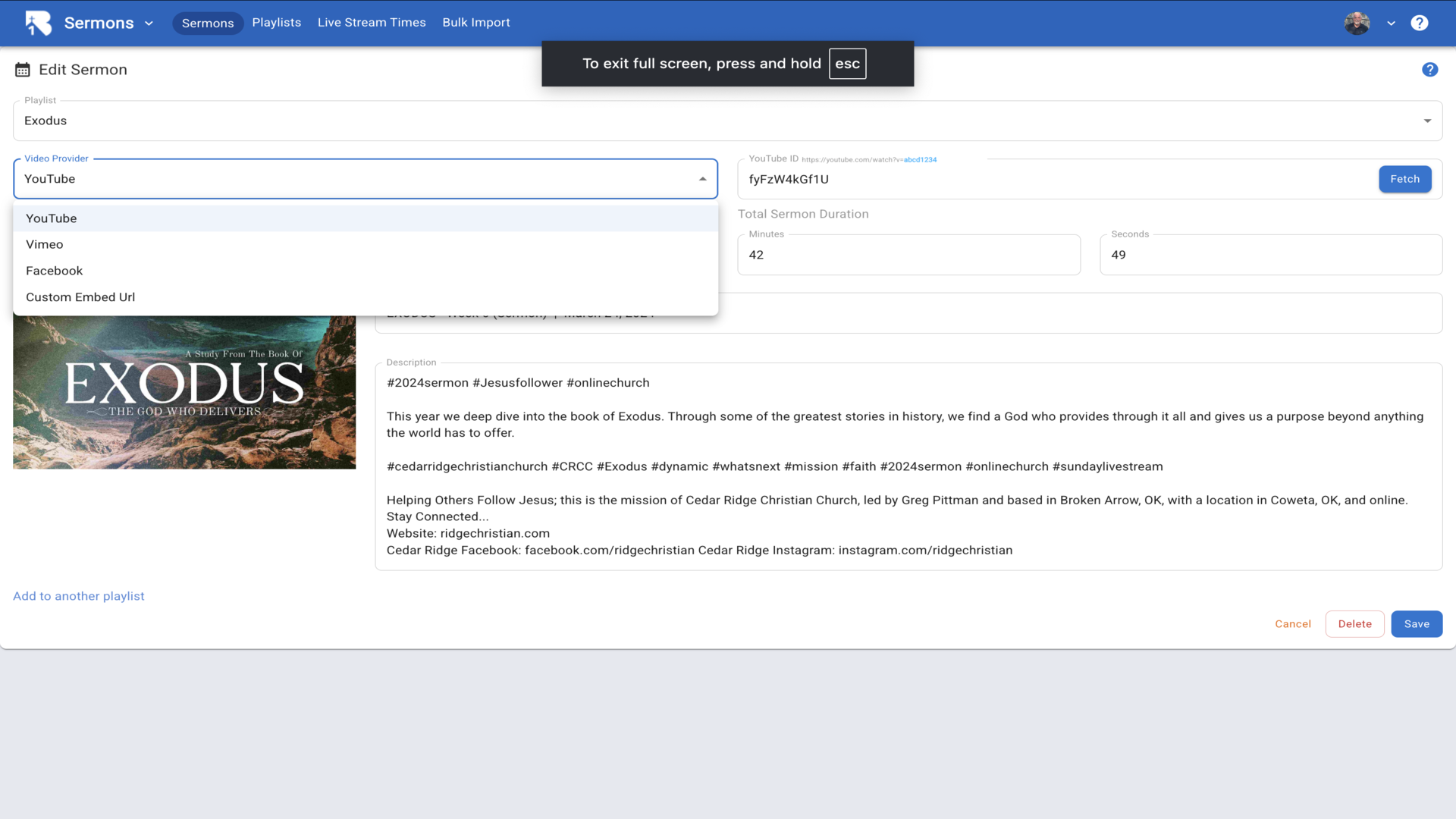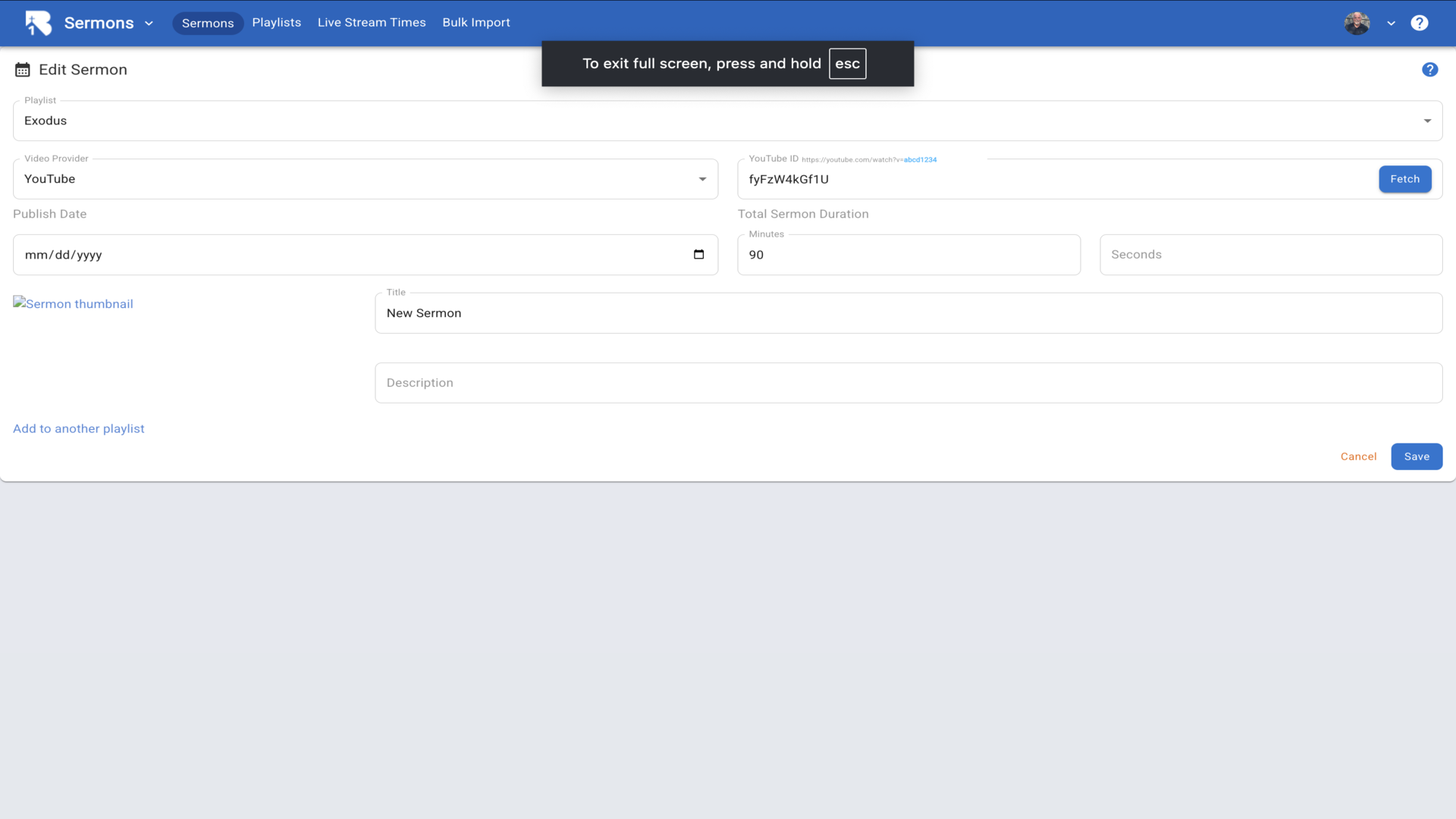 Select a Playlist for your sermon, choose YouTube as the video provider, then enter the YouTube video ID and click Fetch.