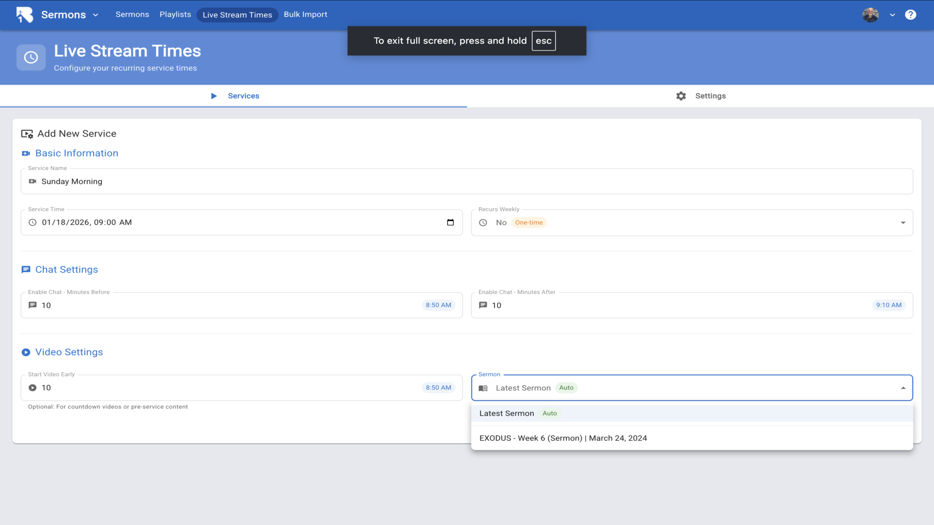To schedule this sermon for a live stream, go to Live Stream Times and select your sermon from the Video Settings dropdown.