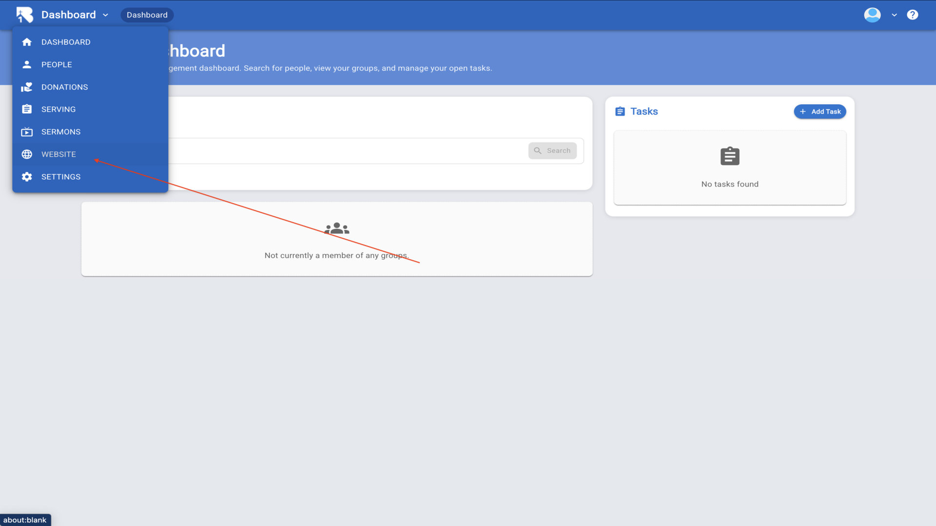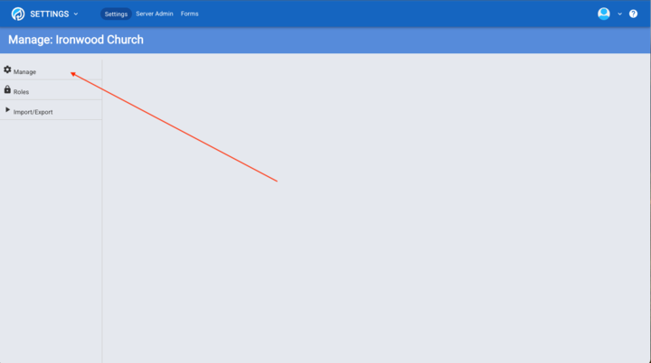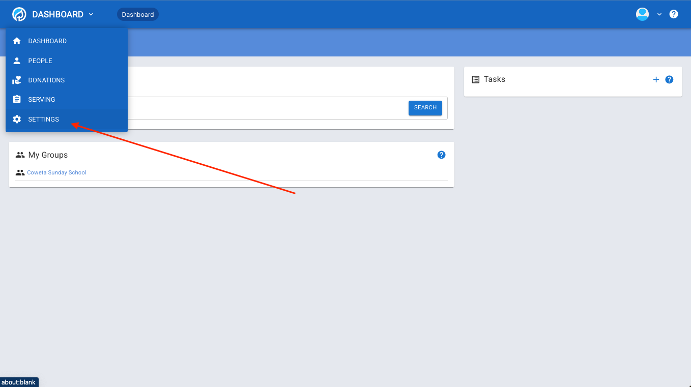 4.In the dashboard pulldown menu click on settings. If you are missing these options, it's because you lack permissions. Request the person who set up your church grant you access to "Edit Church Settings".▼