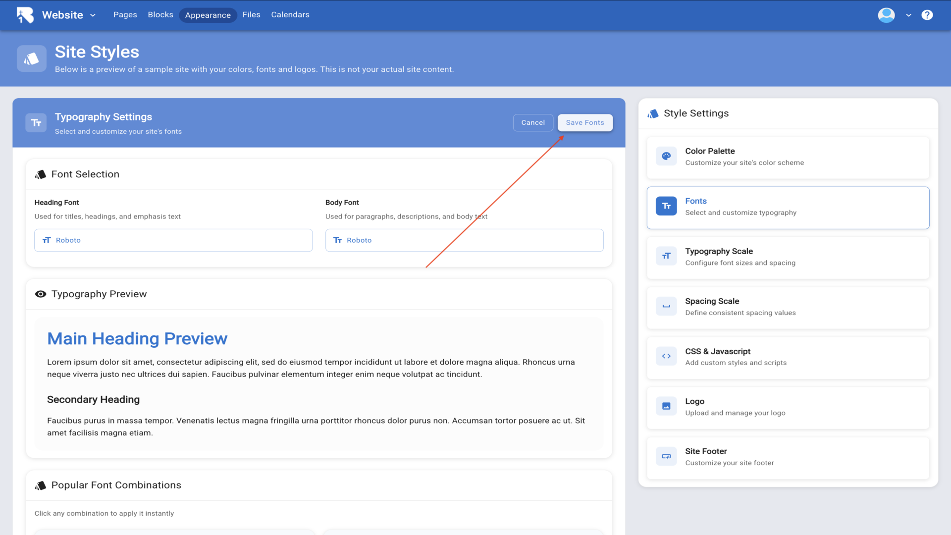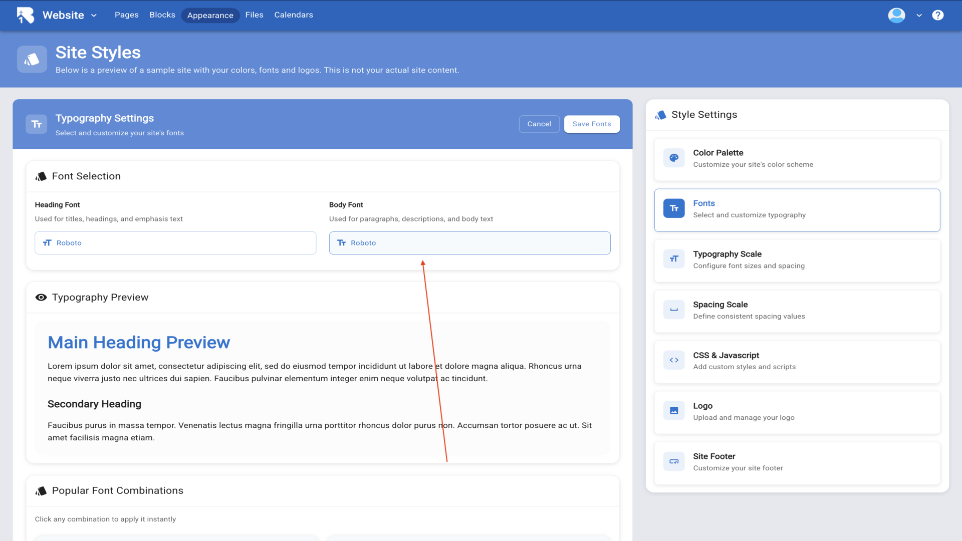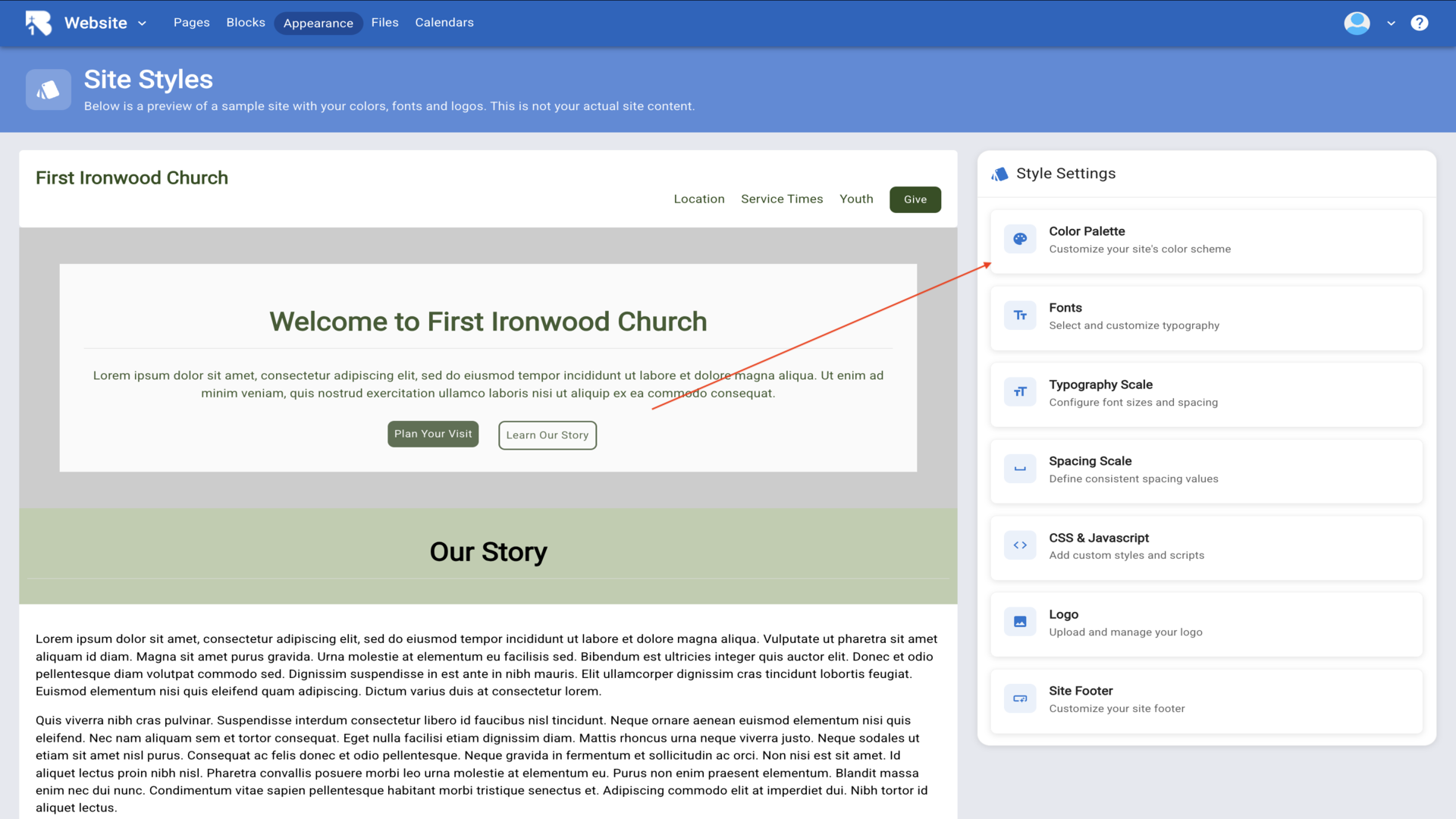 4.The Site Styles page loads, showing a preview of your website with your current colors, fonts, and logos.▼