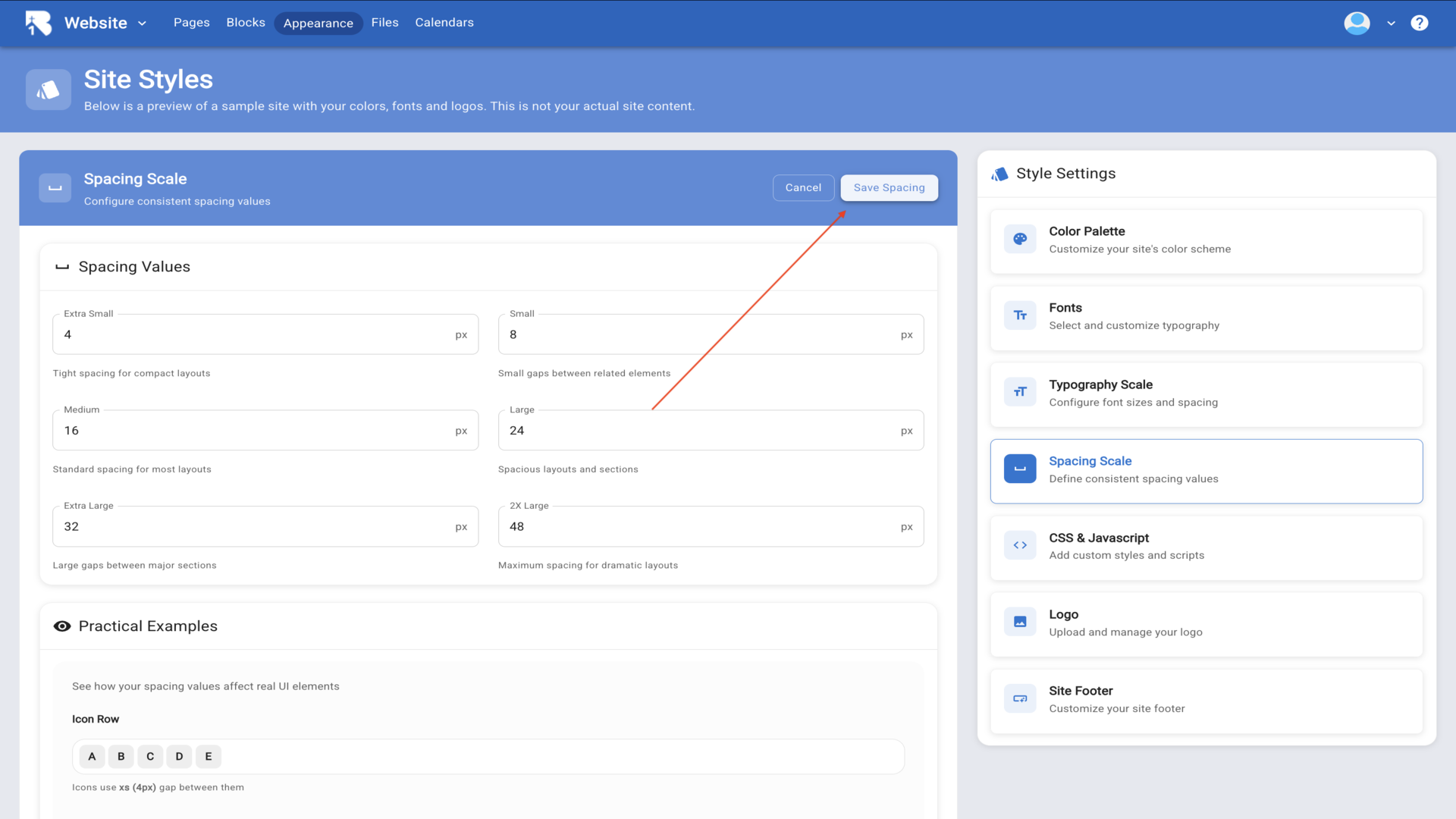 19.When you're satisfied with your spacing values, click Save Spacing to apply them across your entire site.▼