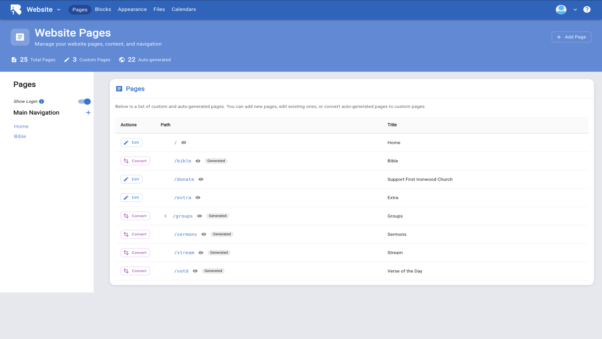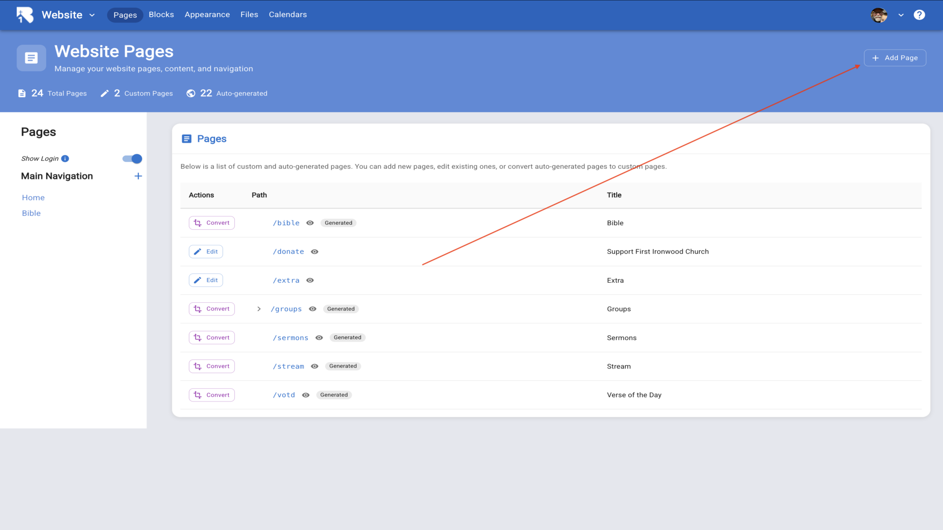 2.This opens Website Pages where you can manage pages and content. Click Add Page at the top right.▼