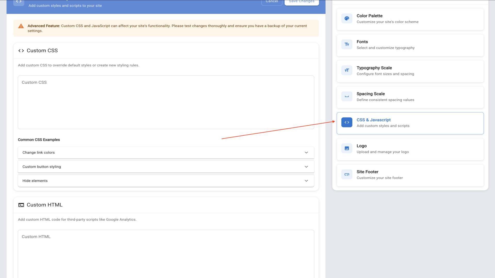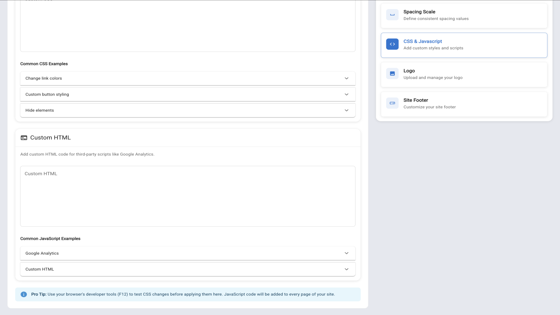 21.Add Custom CSS to override default styles, Custom HTML for tracking codes, and Common Javascript Examples like Google Analytics.▼