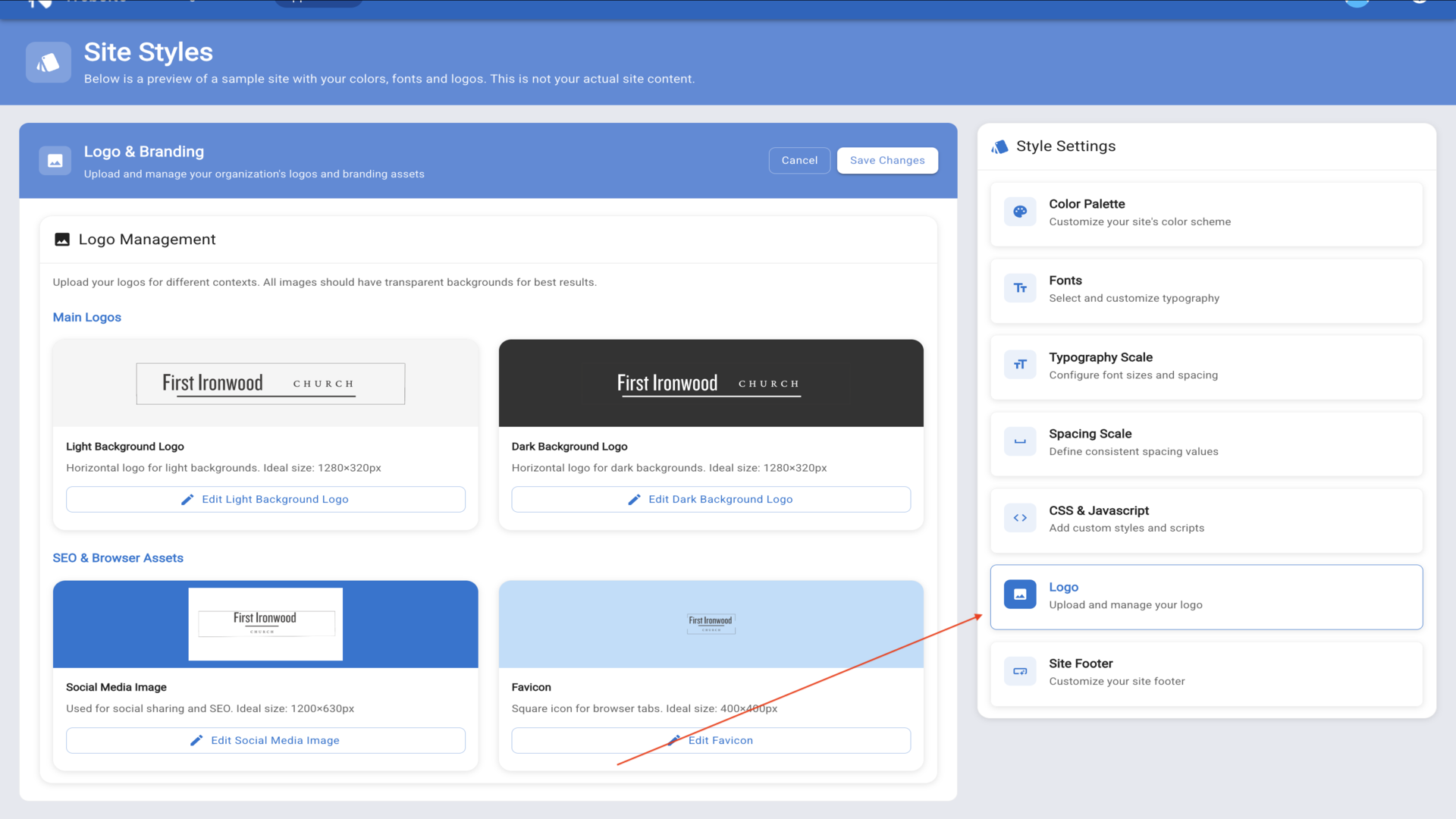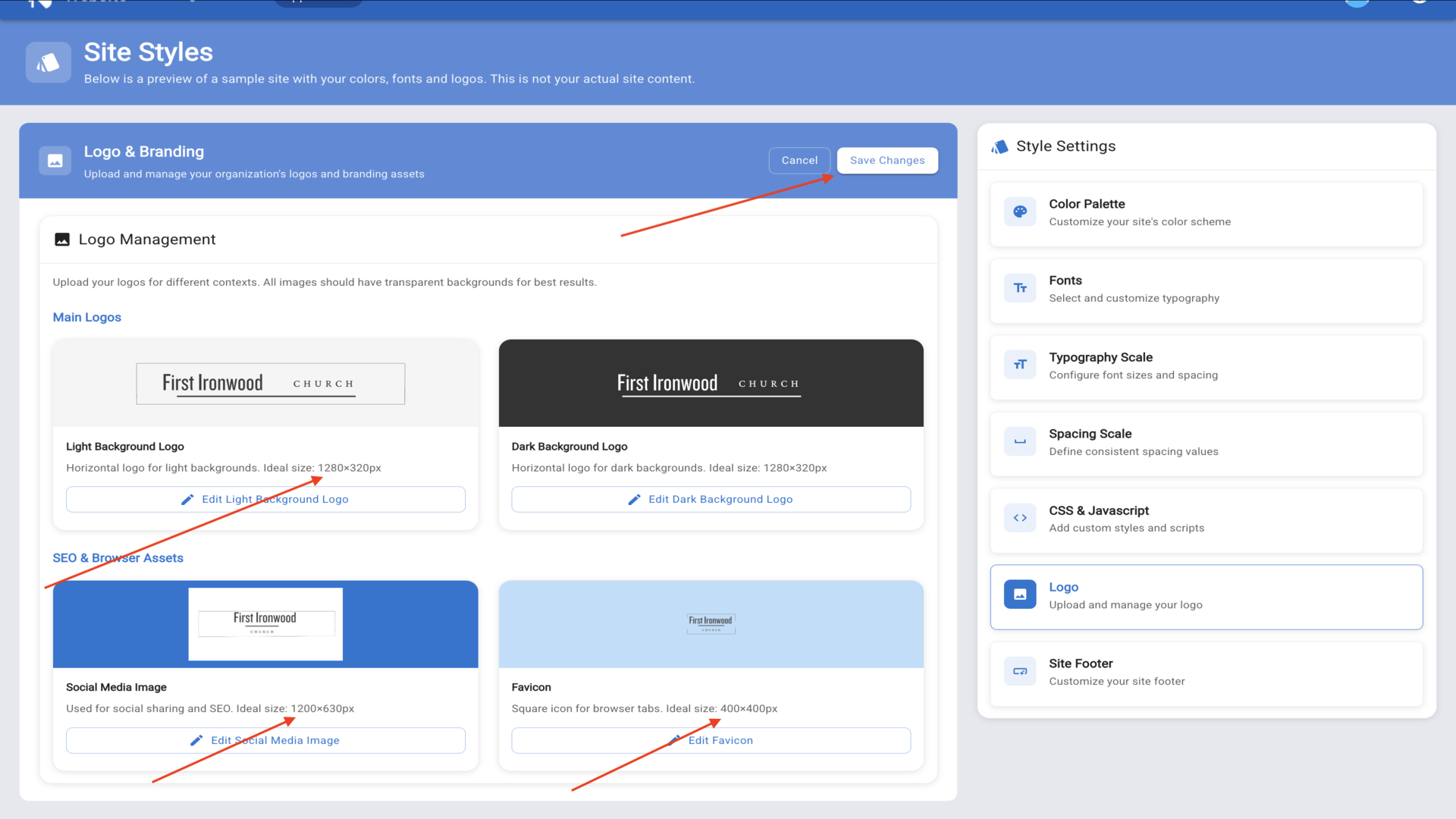 23.Upload your Light Background Logo, Dark Background Logo, Social Media Image, and Favicon. Your uploaded logo appears in the site preview.▼