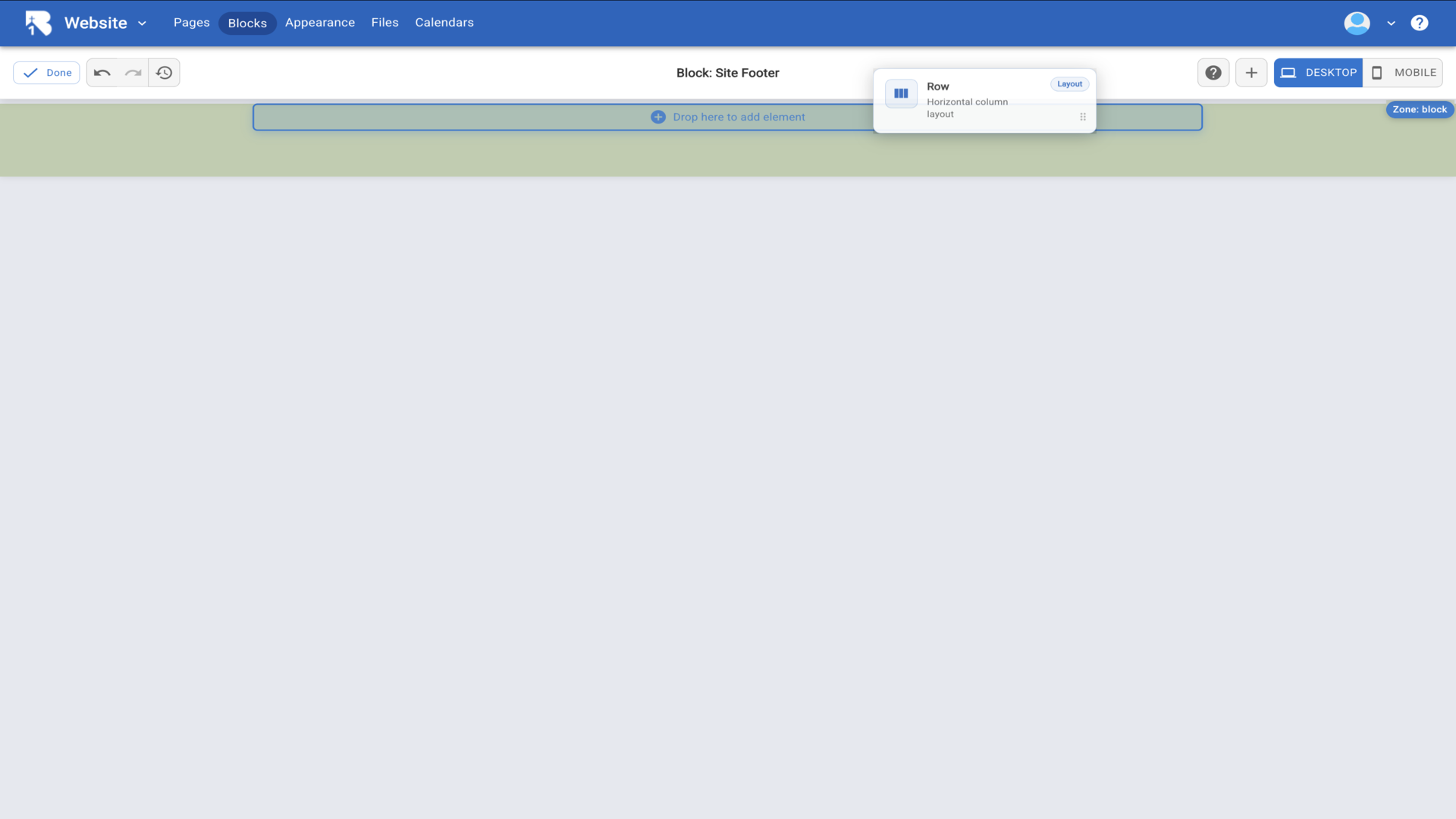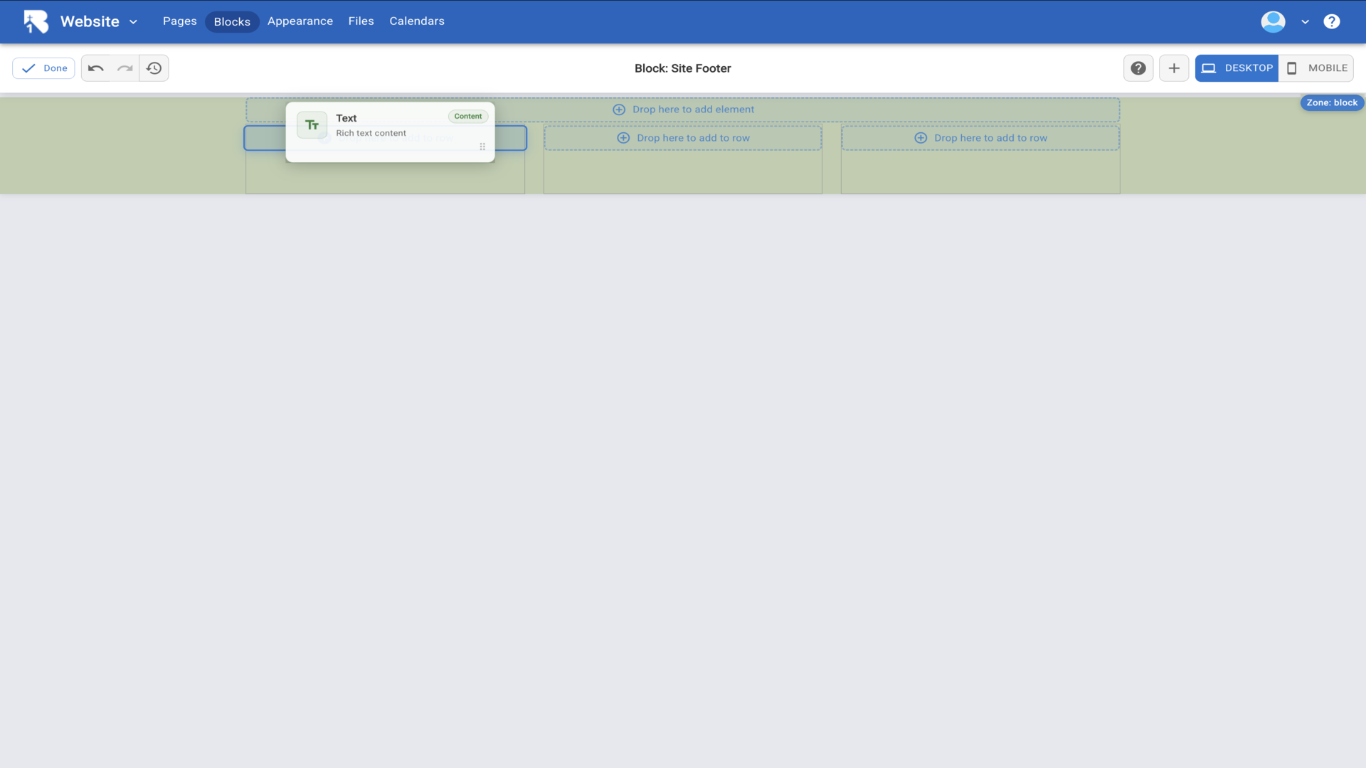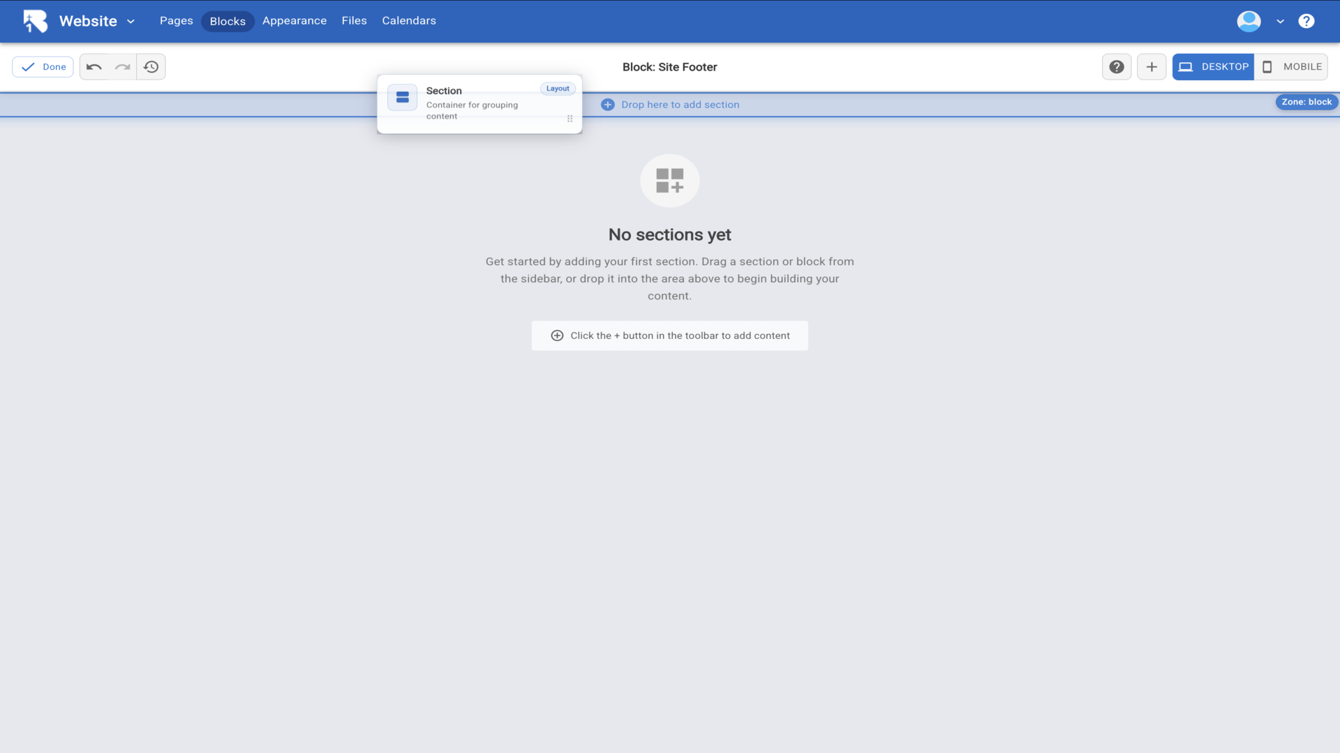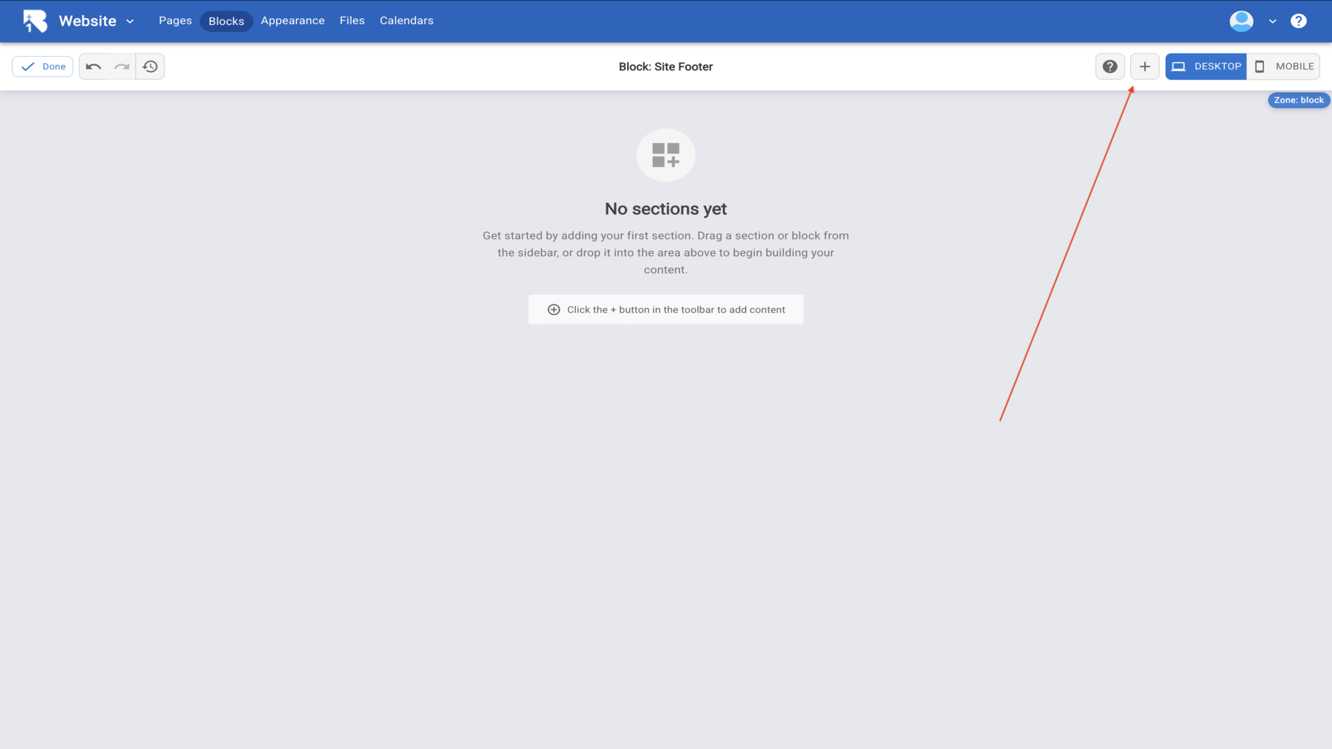 25.The Site Footer editor opens showing an empty canvas. Click the plus button in the toolbar to add content.▼