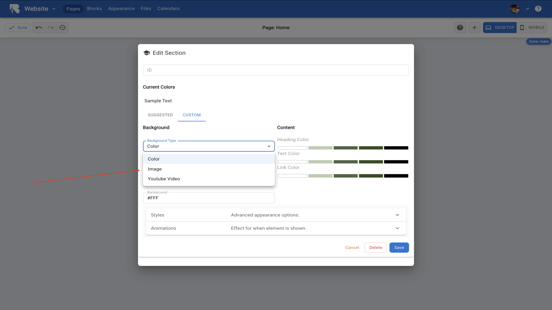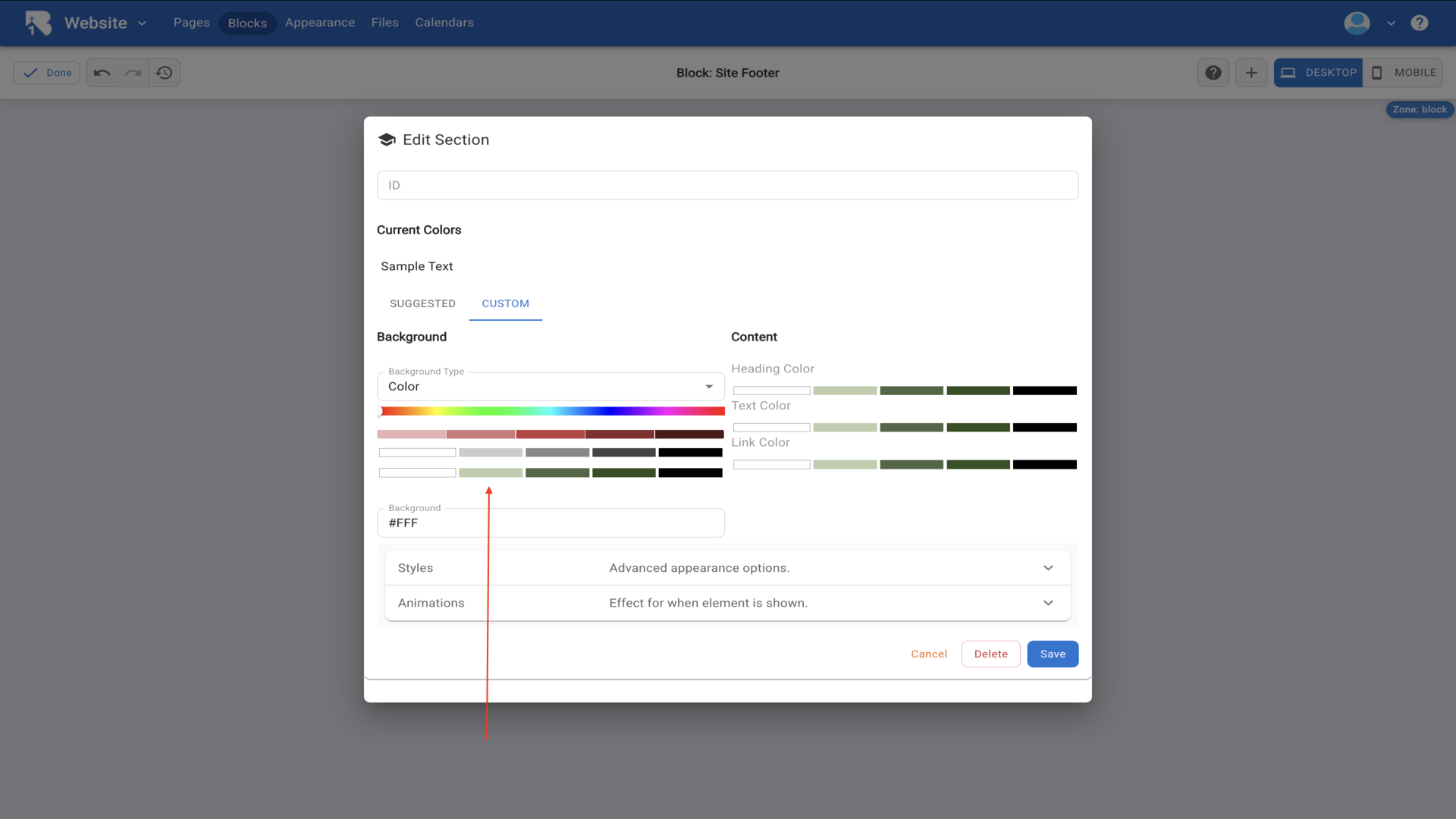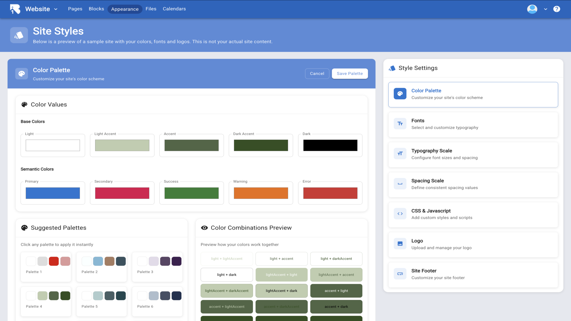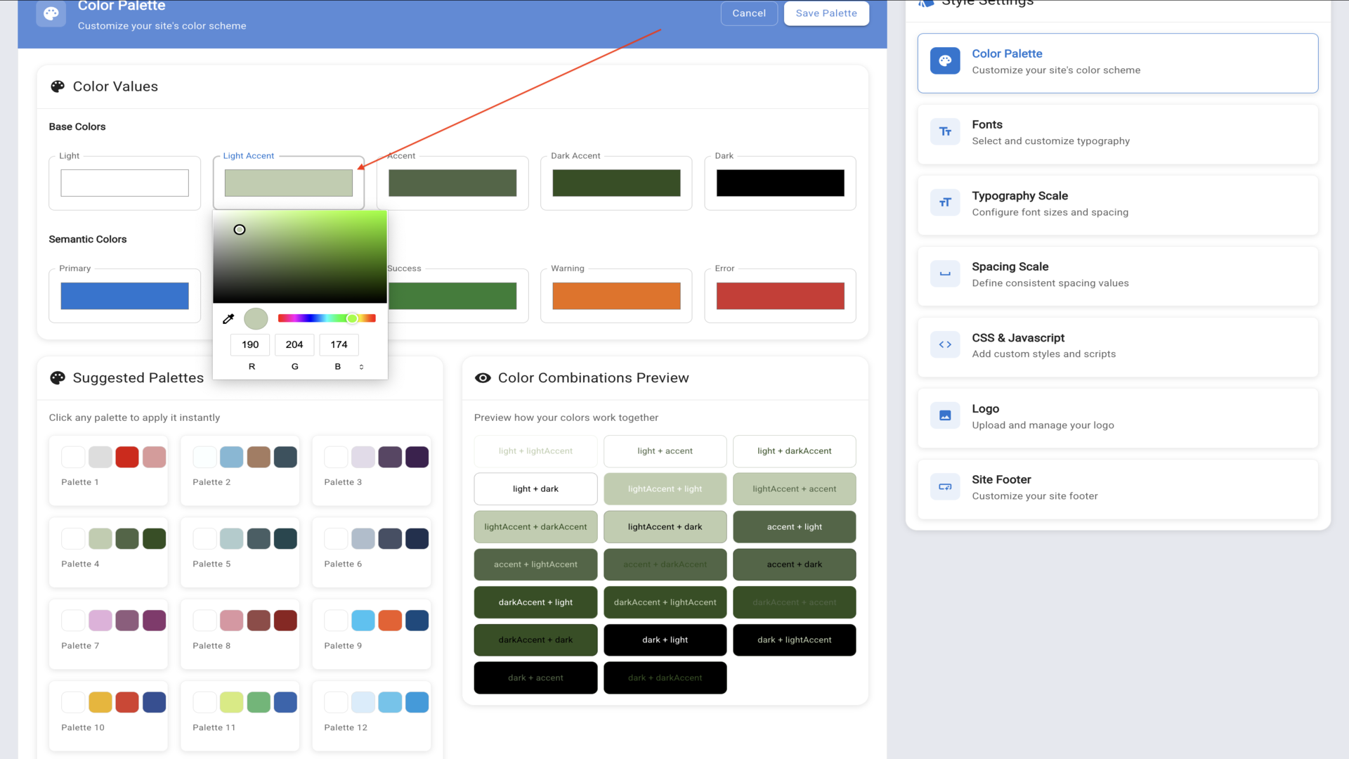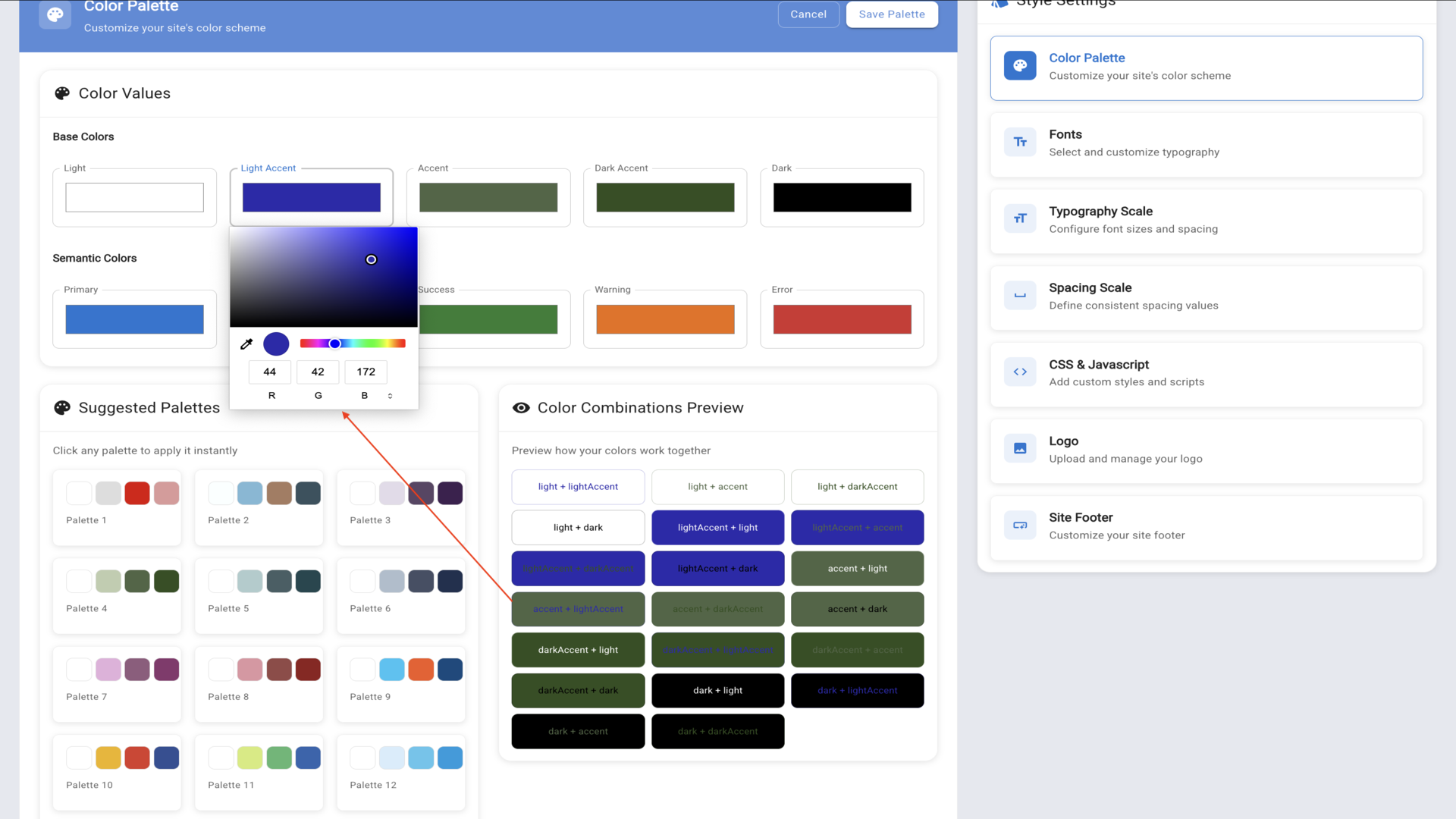 5.On the right side you'll see Style Settings options. Click Color Palette to customize your site's colors.▼
