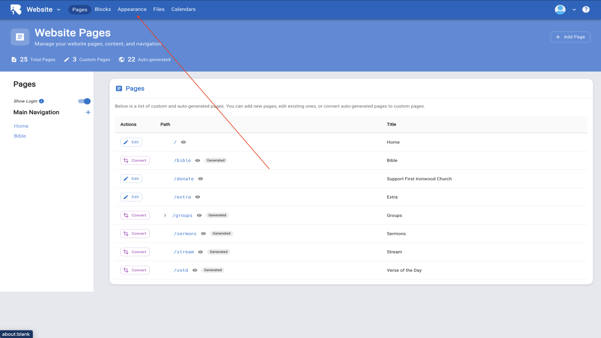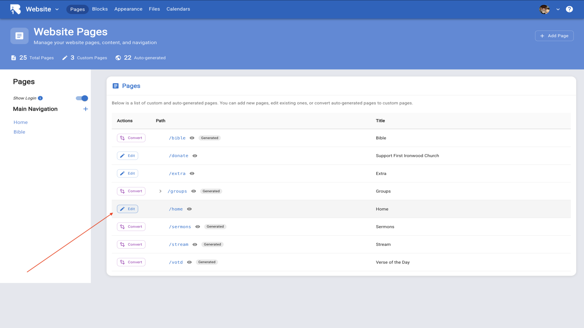 2.This opens the Website Pages view where you manage all your pages.▼