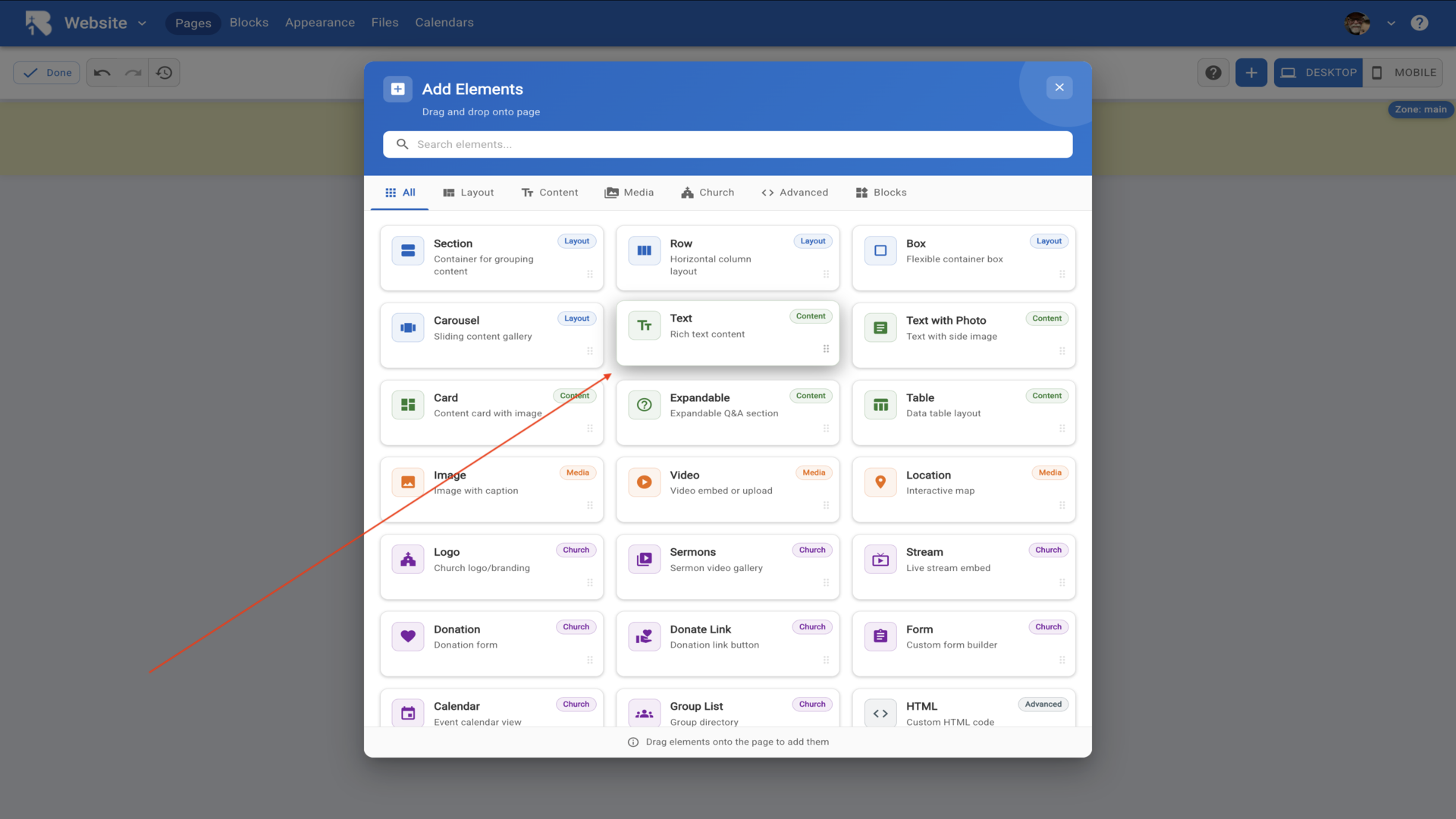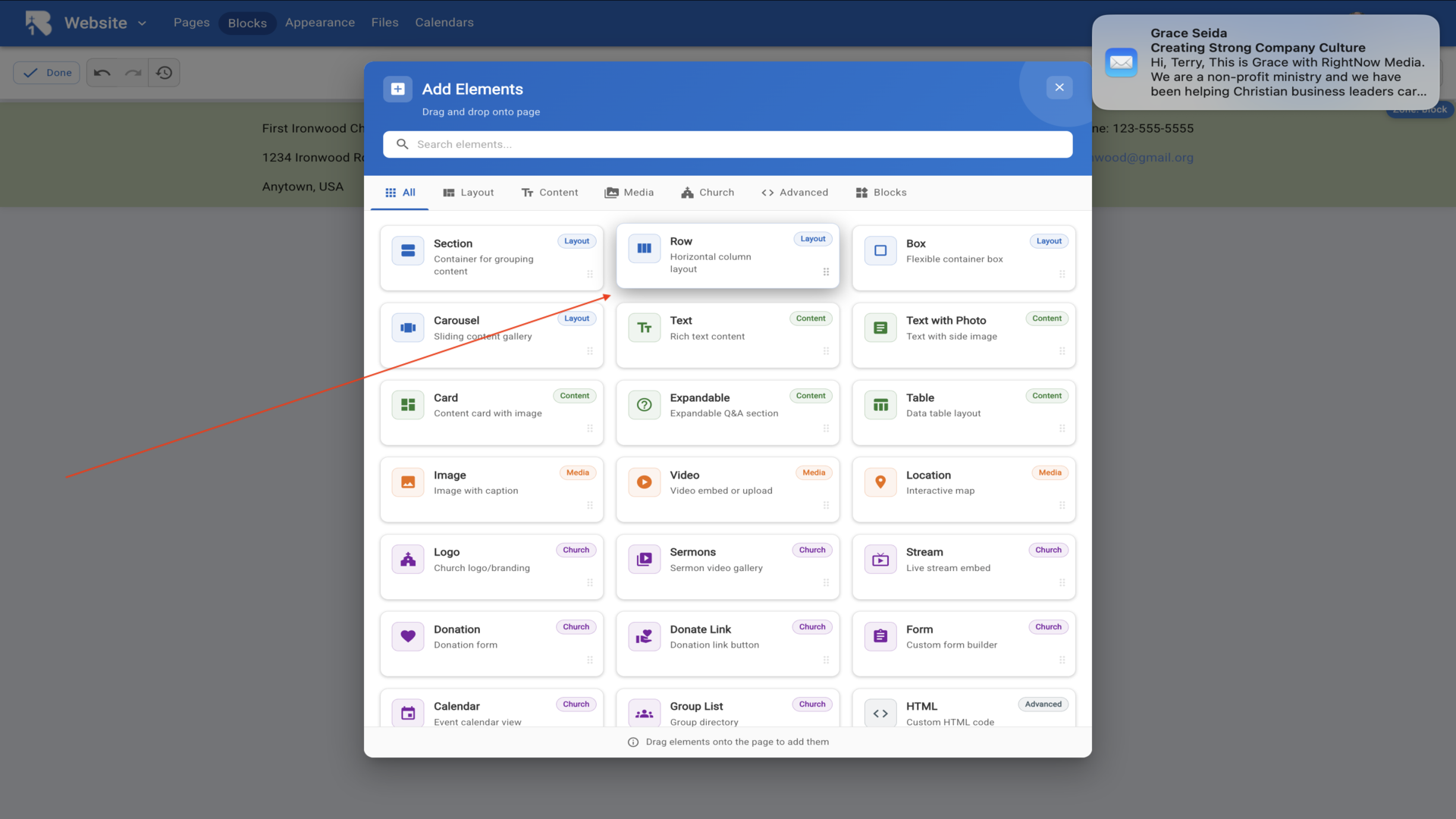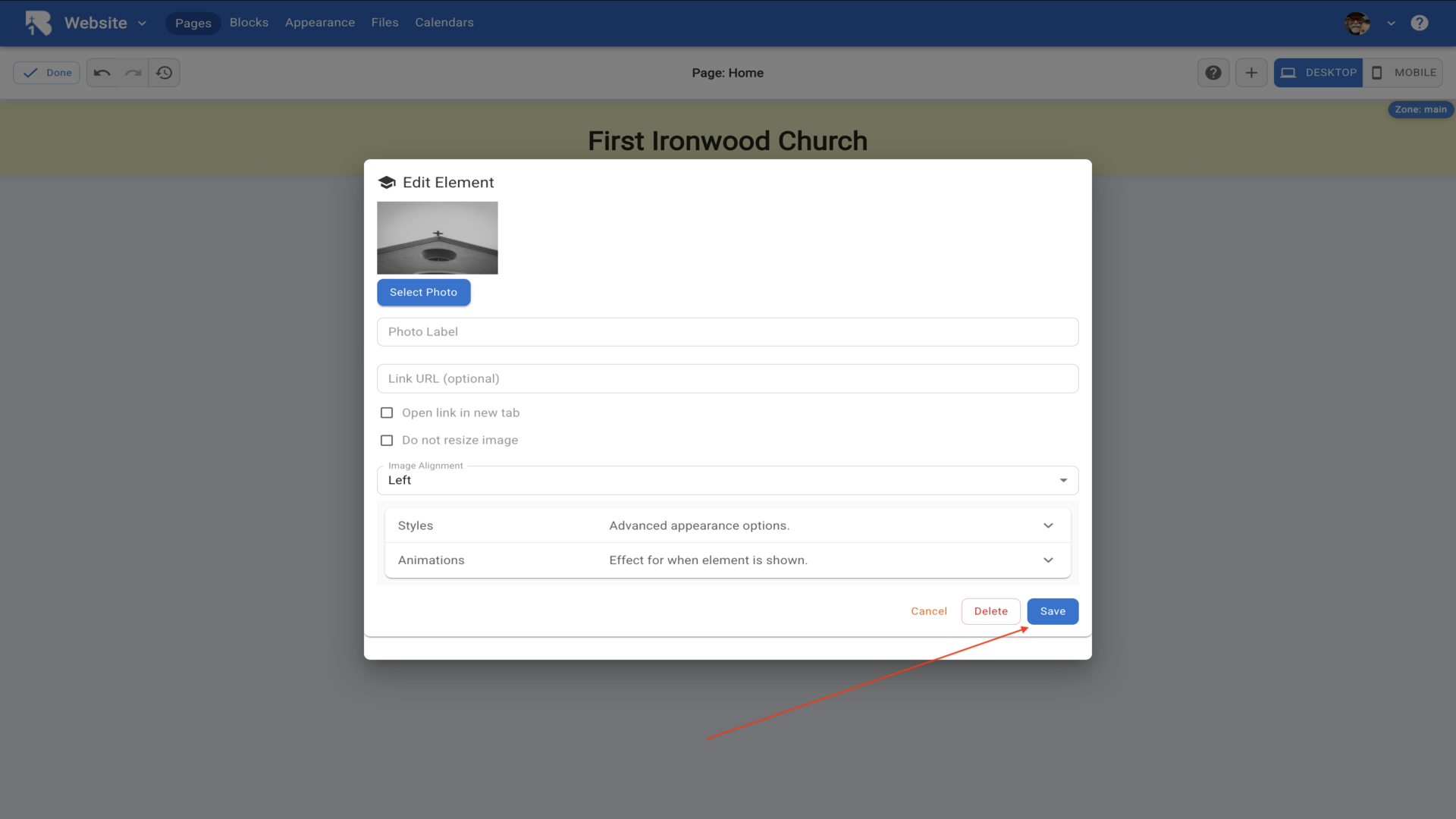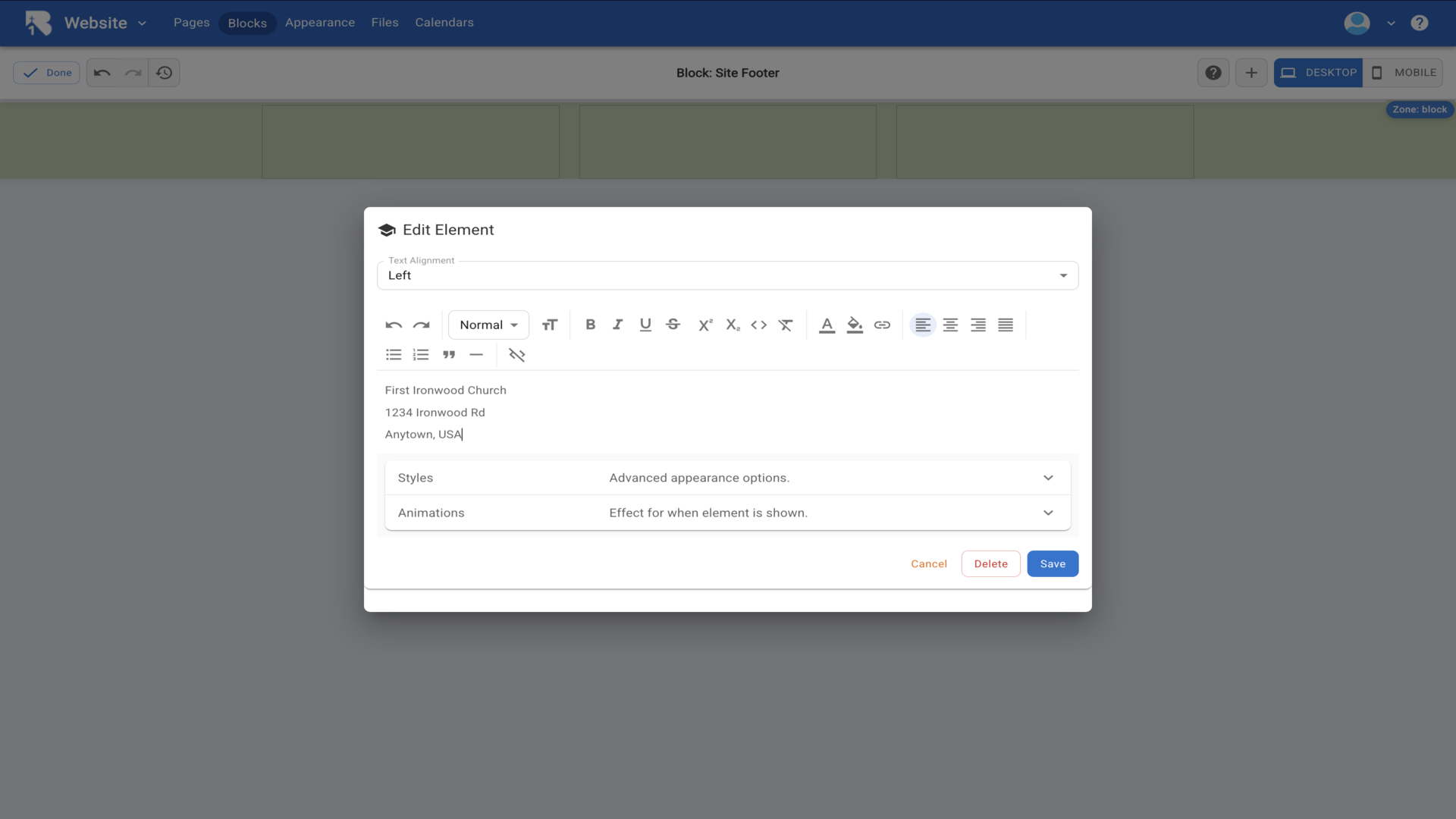 36.The Edit Element dialog opens with a text editor. Type your church information and use the formatting toolbar to style your text.▼