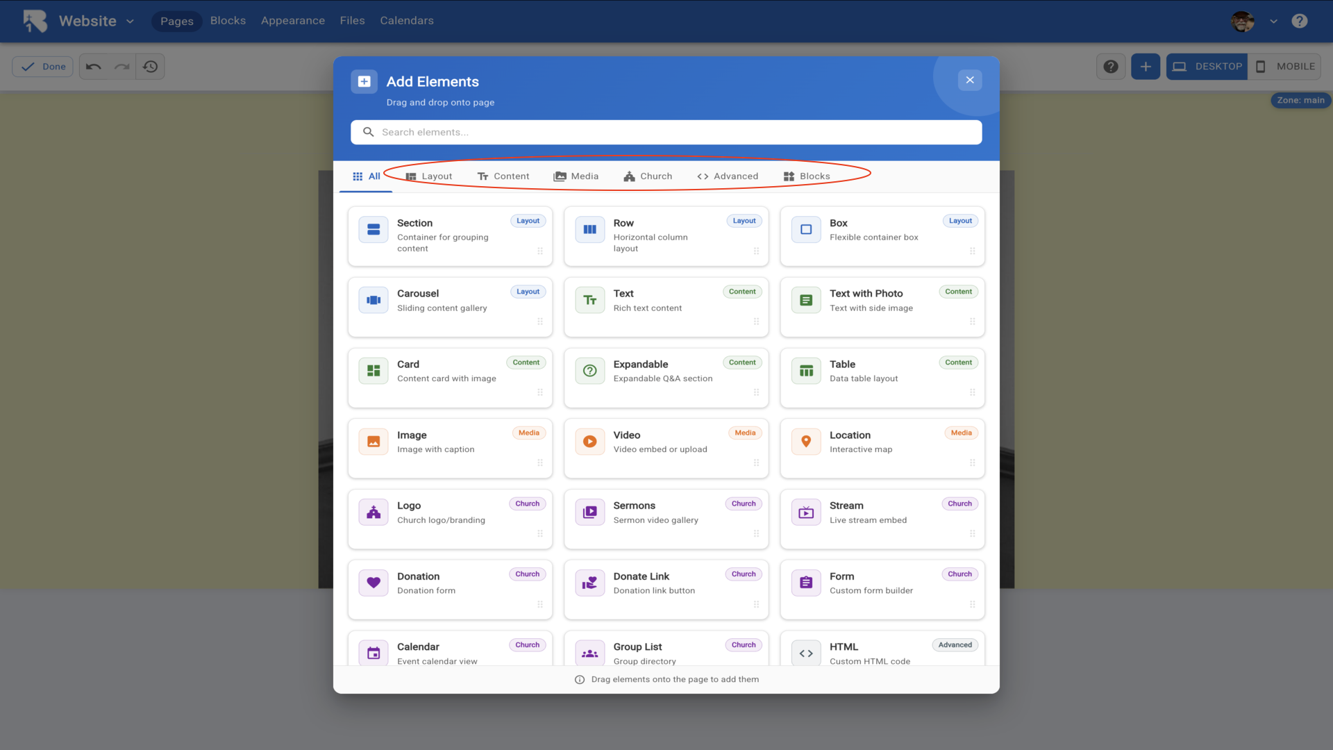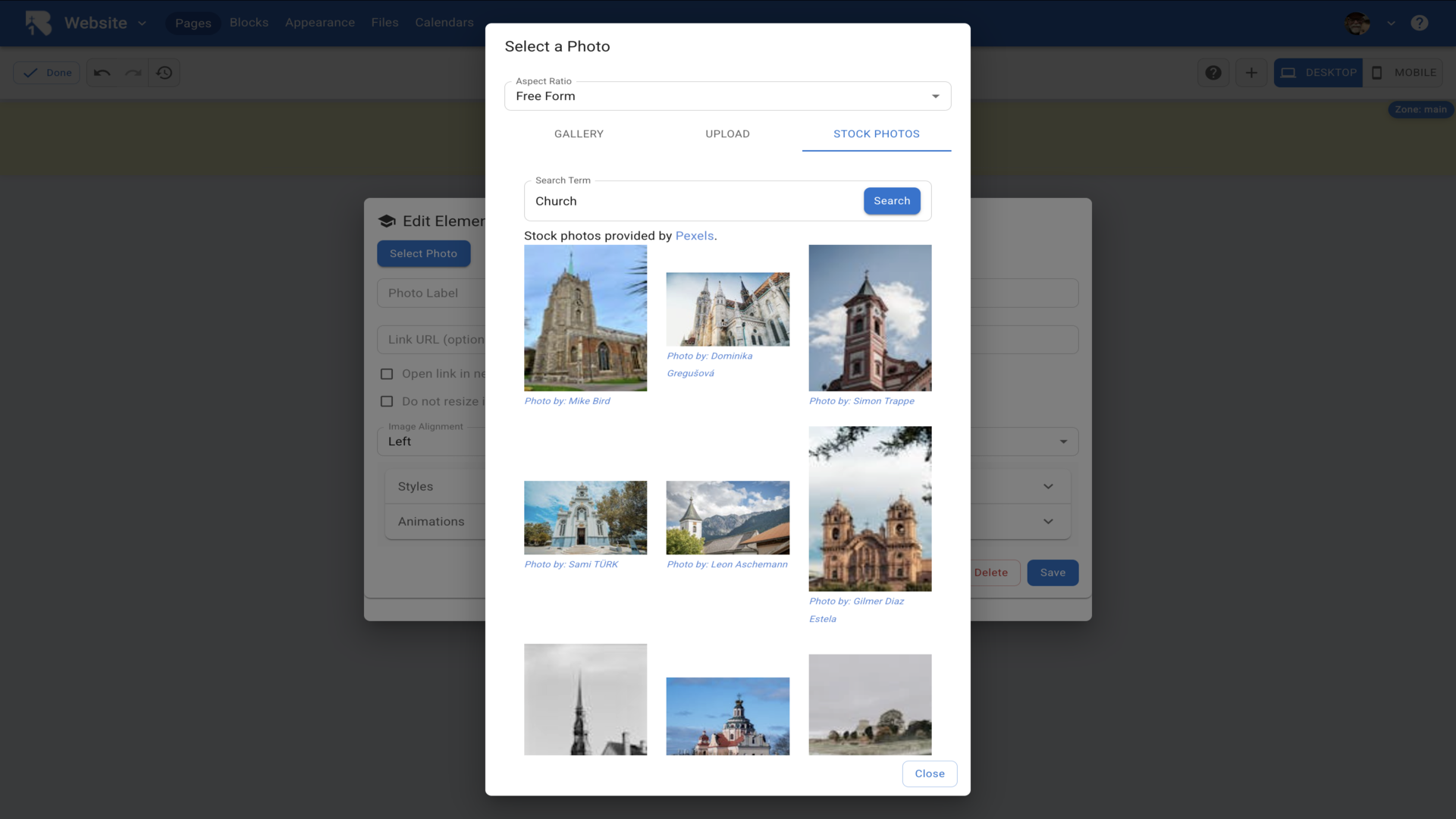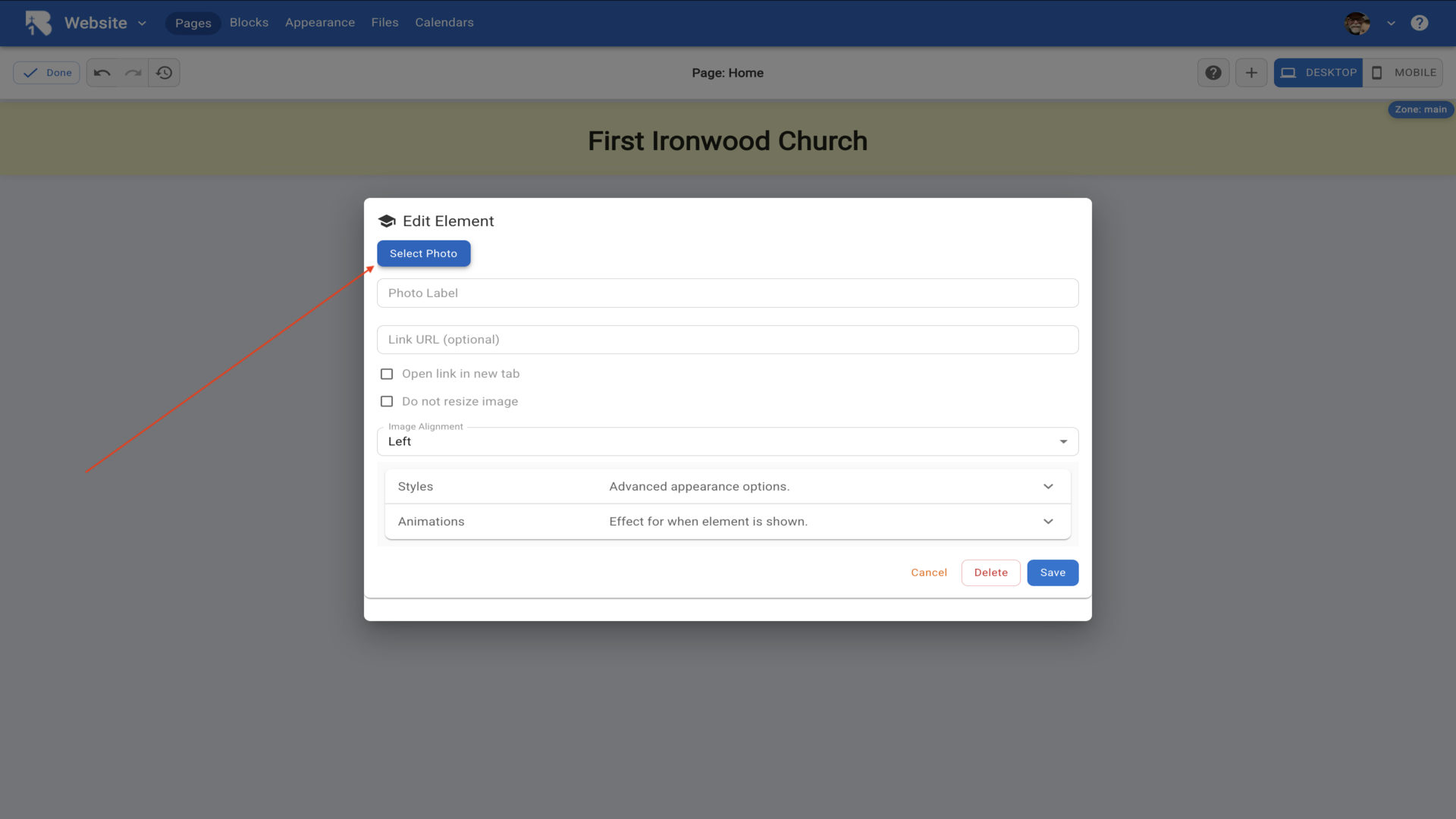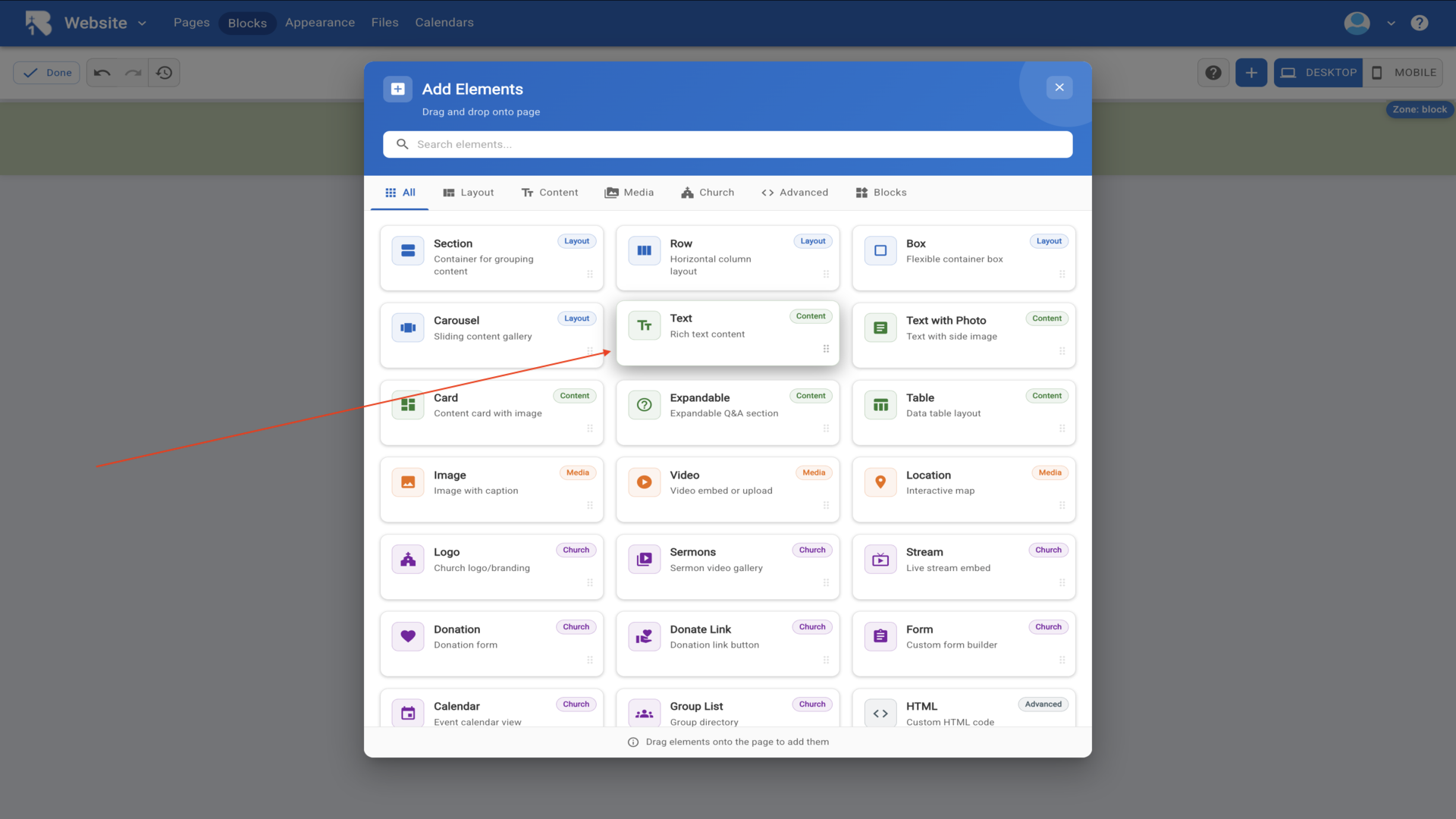 36.The Edit Element dialog opens with a text editor. Type your church information and use the formatting toolbar to style your text.▼