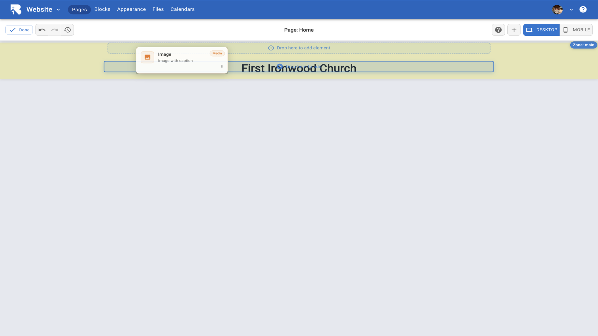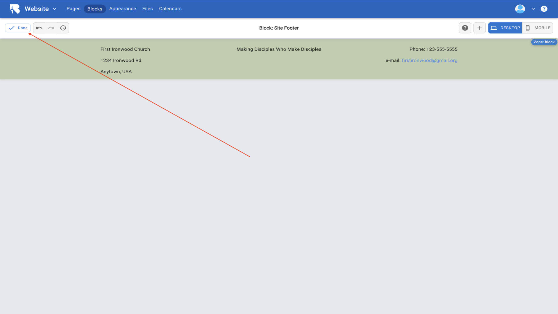 37.Click Done to save your footer. Your completed footer now shows with all your church information and will appear on every page of your website.▼