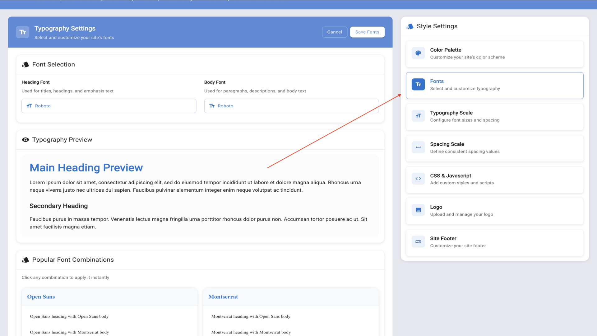 10.In the Typography Settings panel, you'll see options for Font Selection and a preview showing how headings will look.▼