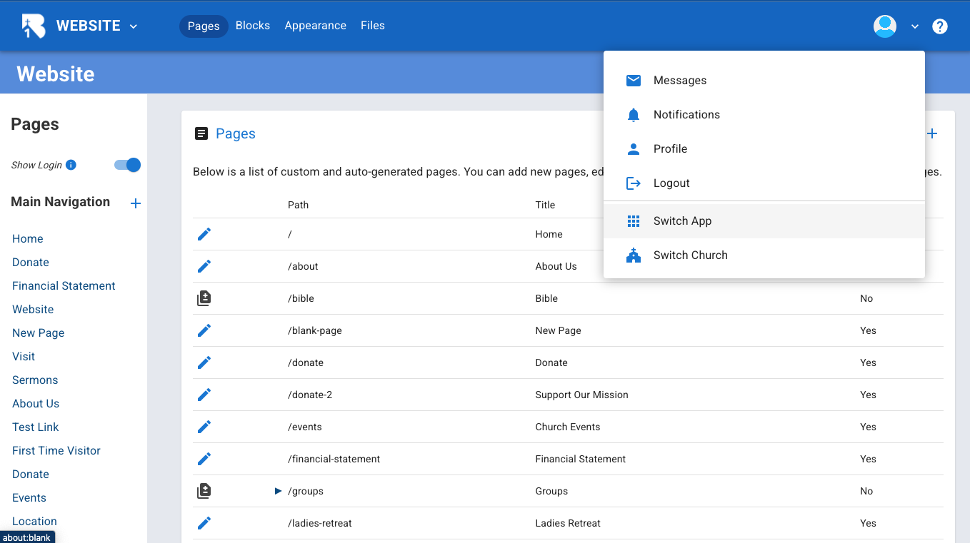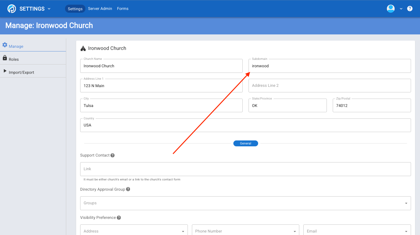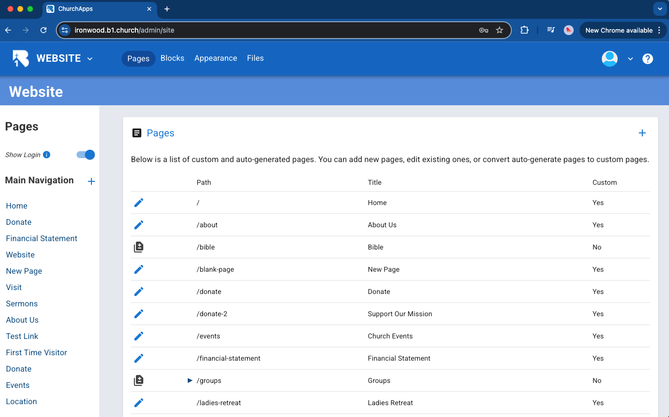 5.Click on manage. Every church that uses B1 has a subdomain assigned to them. In our case, we have chosen "ironwood" as the subdomain for our test church of Ironwood Church. This means we can go to ironwood.b1.church to get to our B1 content.▼