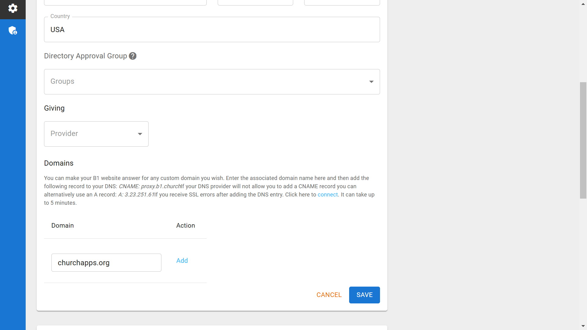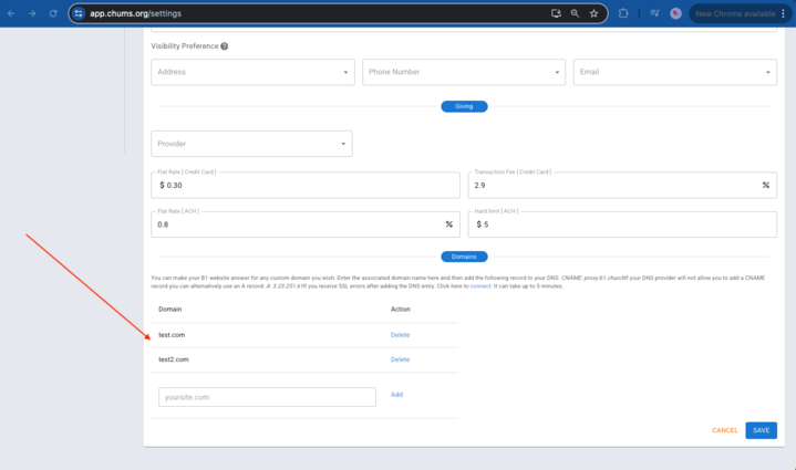 7.In addition to the subdomain, you can set up your own custom domains to point to your B1 site. For example, the site ChurchApps.org is hosted with B1.▼
