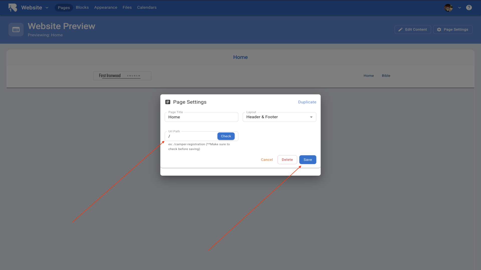 8.For the home page, enter a forward slash with no text. Other pages use forward slash and page title. Click Save.▼
